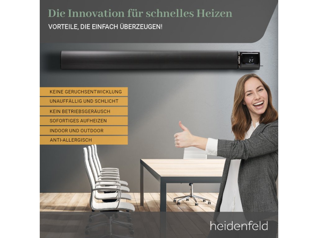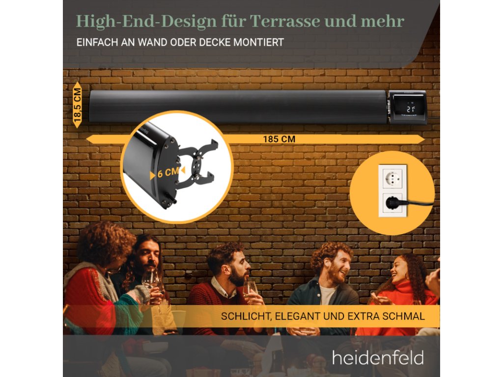 Nenápadný, jednoduchý a elegantný: V klasickej čiernej farbe je tmavý radiátor Heidenfeld Inferno DH700 sotva viditeľný, či už je namontovaný na strope alebo na stene. Vďaka šírke iba 6 cm je to navyše mimoriadne štíhly model.