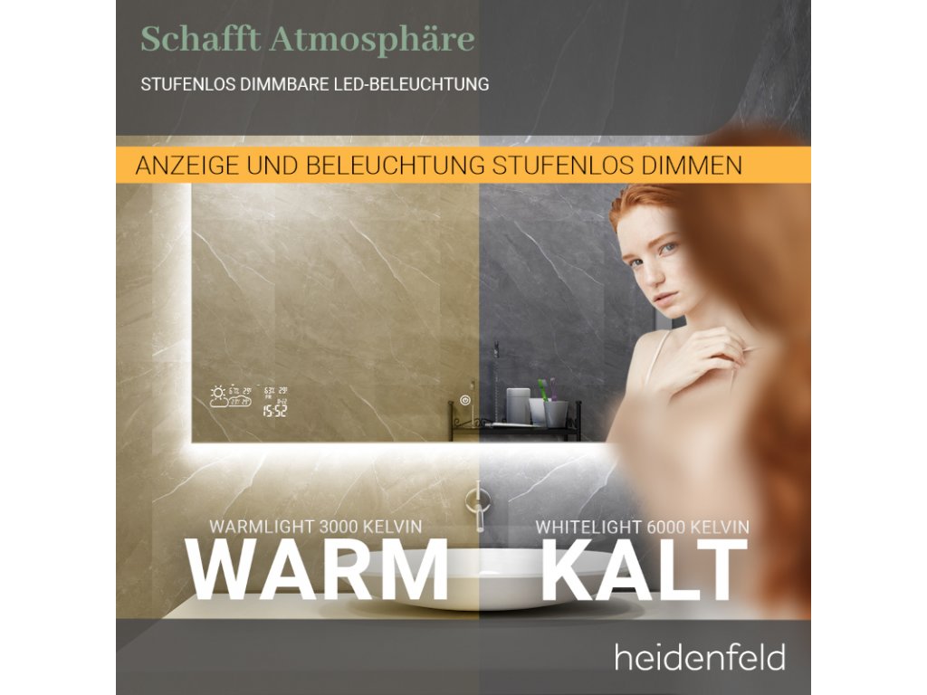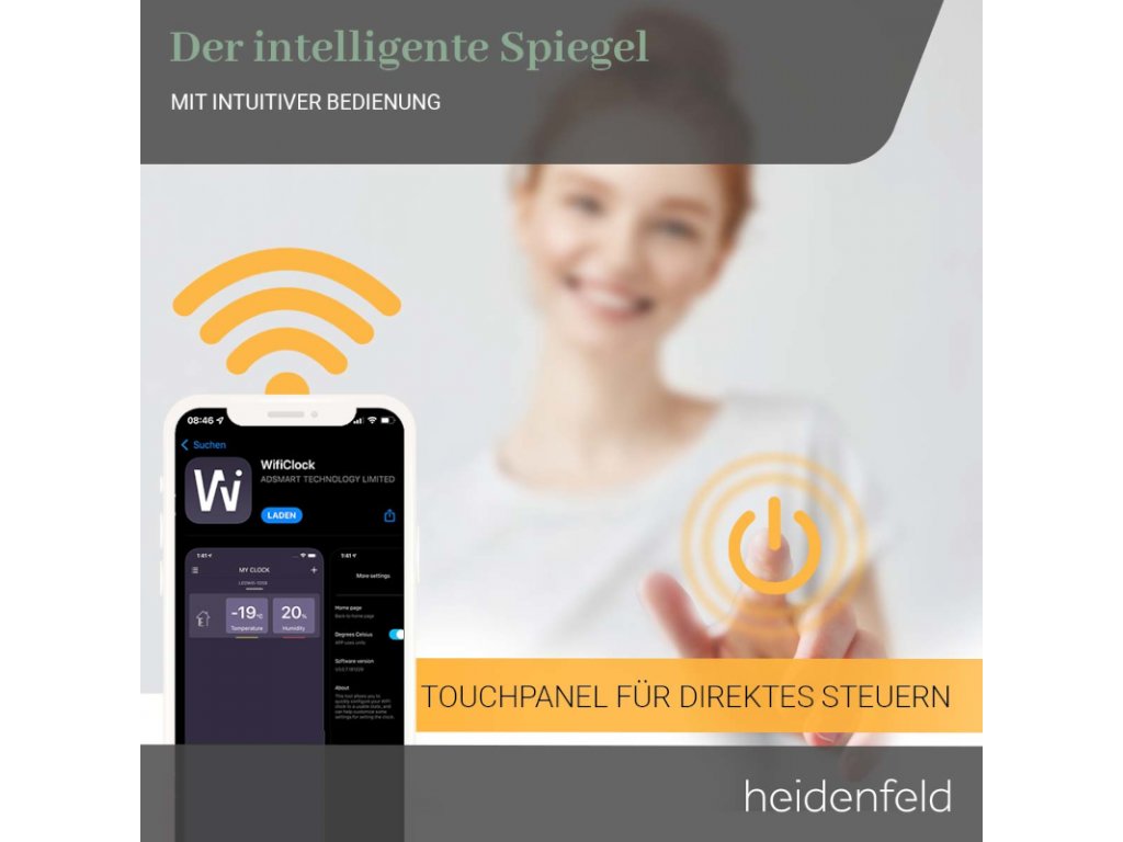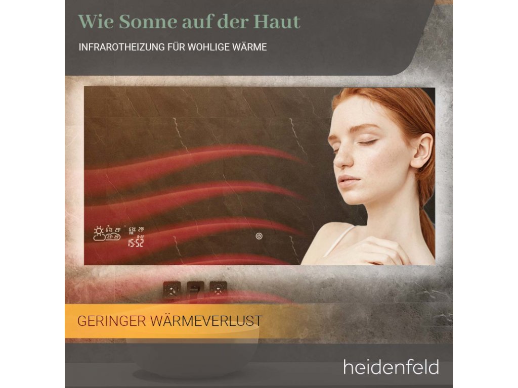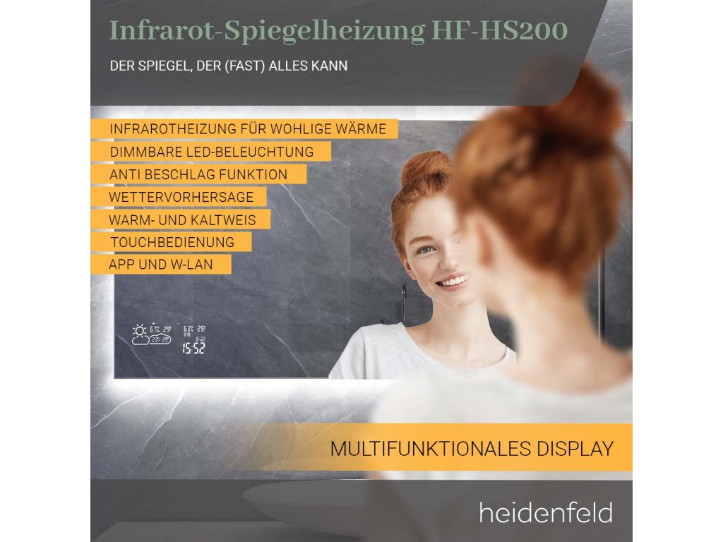 V budúcnosti, keď sa ráno pozriete do zrkadla, privíta vás upokojujúce teplo z infračerveného vykurovania a príjemné svetlo z LED rámu. Pre vykurovanie máte na výber medzi rôznymi wattovými variantmi - vhodnými pre veľkosť vašej miestnosti. Osvetlenie si môžete navrhnúť aj podľa svojho vkusu vďaka rôznym nastaveniam. Ale infračervený ohrievač zrkadiel Heidenfeld HF-HS200 dokáže ešte viac! Pretože tu nevidíte len svoj odraz: Vďaka WiFi pripojeniu máte prístup k praktickému displeju. Počasie, dátum, čas, teplota a vlhkosť sú vždy viditeľné. A to nie je všetko: inteligentné vyhrievanie zrkadla je vybavené funkciou proti zahmlievaniu . Jasný výhľad je vždy zaručený!
