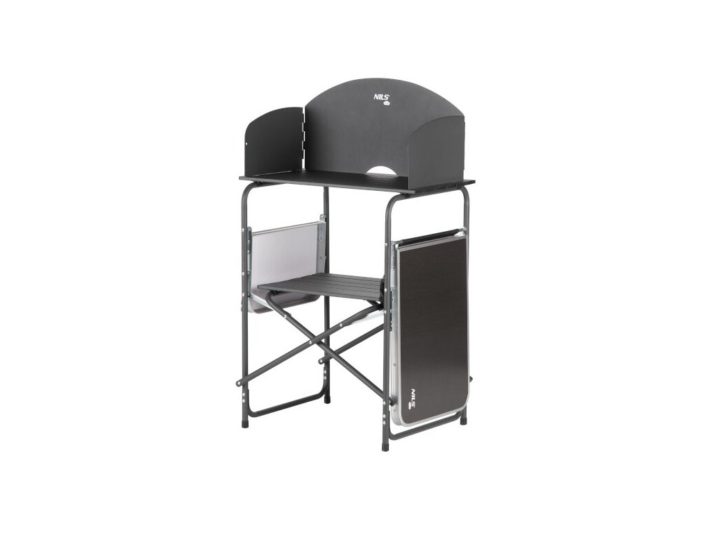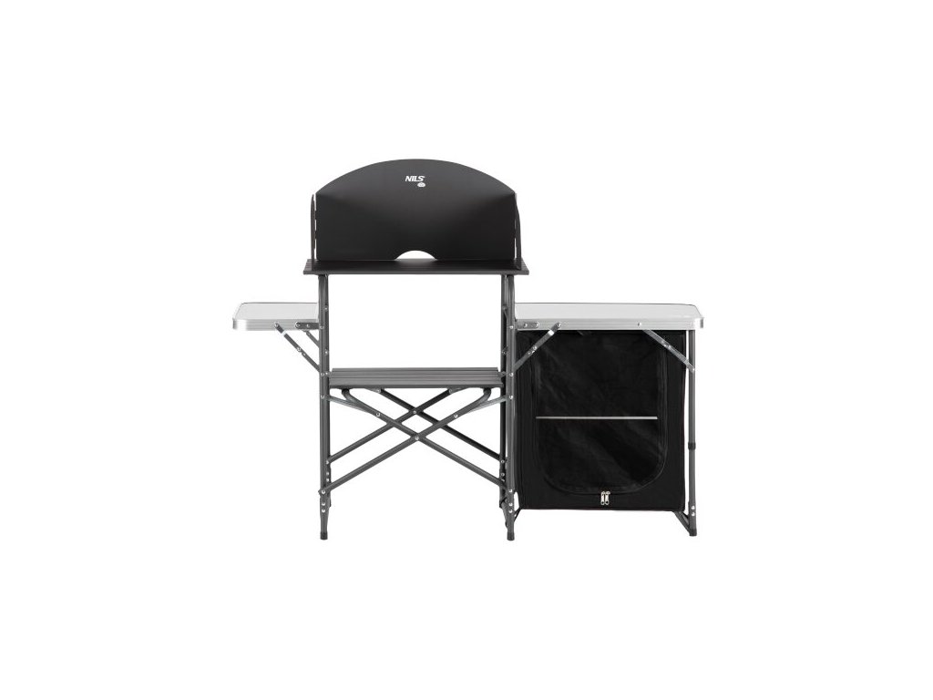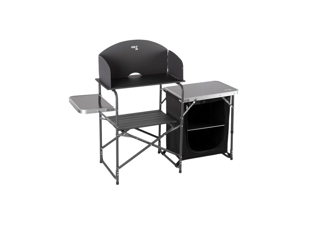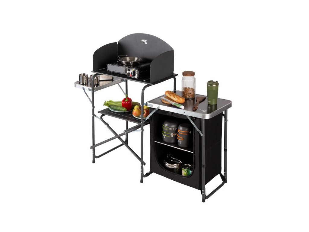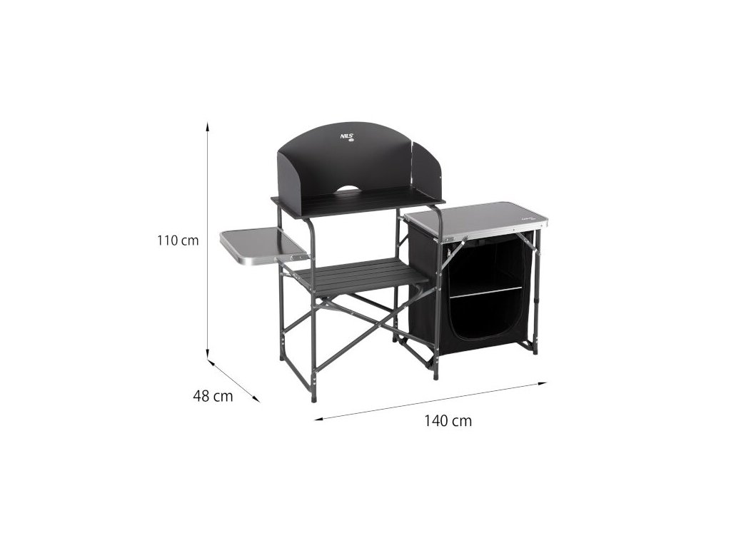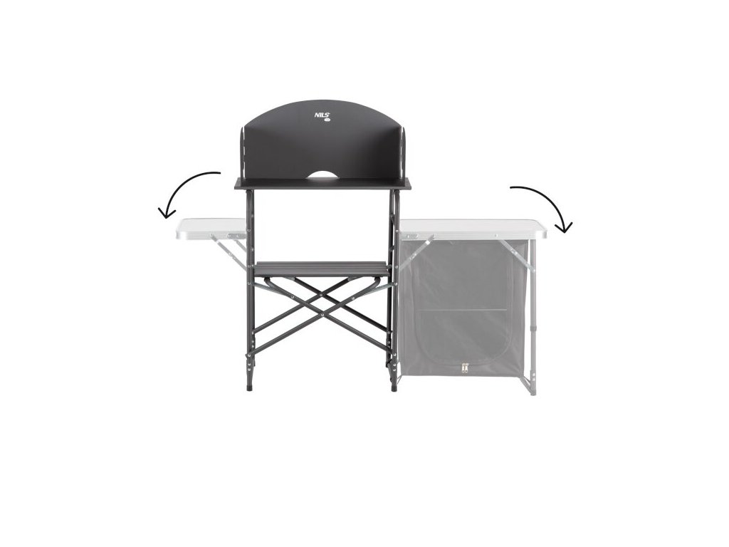 Integrované bočné dosky s hliníkovým rámom sú odolné voči meniacim sa poveternostným podmienkam a ľahko sa udržujú v čistote. Bočné dosky je možné ľahko zložiť, čím sa zmenšujú rozmery skrine, čo umožňuje jej prispôsobenie akýmkoľvek podmienkam kempovania. Otvorené police a skrinka na zips poskytujú dostatok priestoru na bezpečné uloženie vašich kulinárskych pokladov. Celú skriňu možno ľahko zložiť a zabaliť do tašky s uchom, čo uľahčuje prepravu a skladovanie skrine.