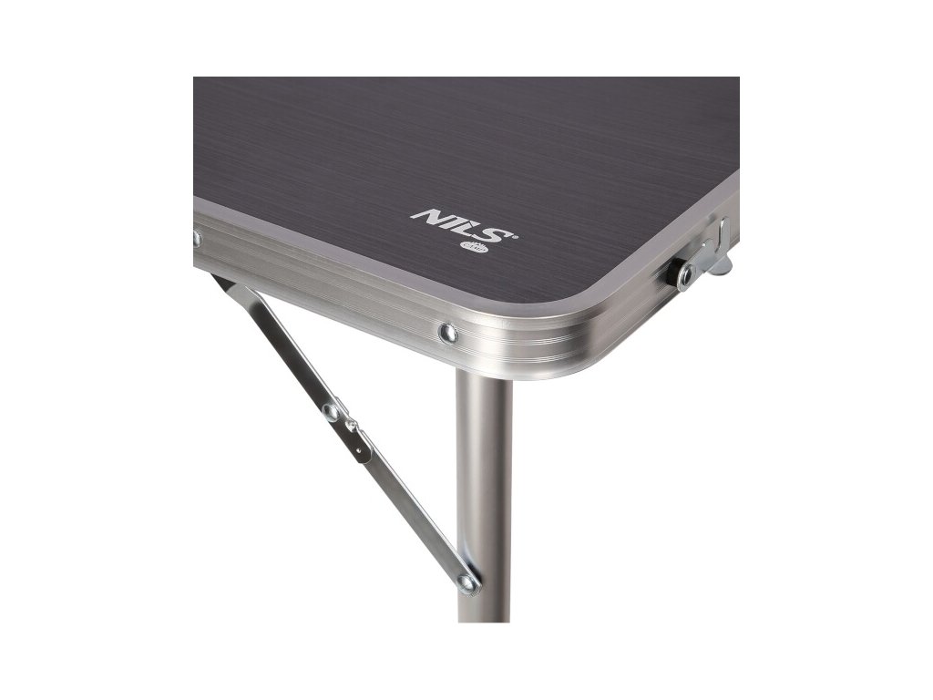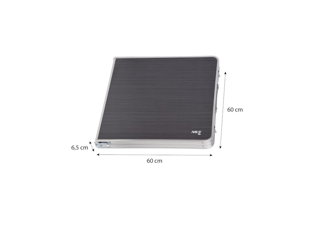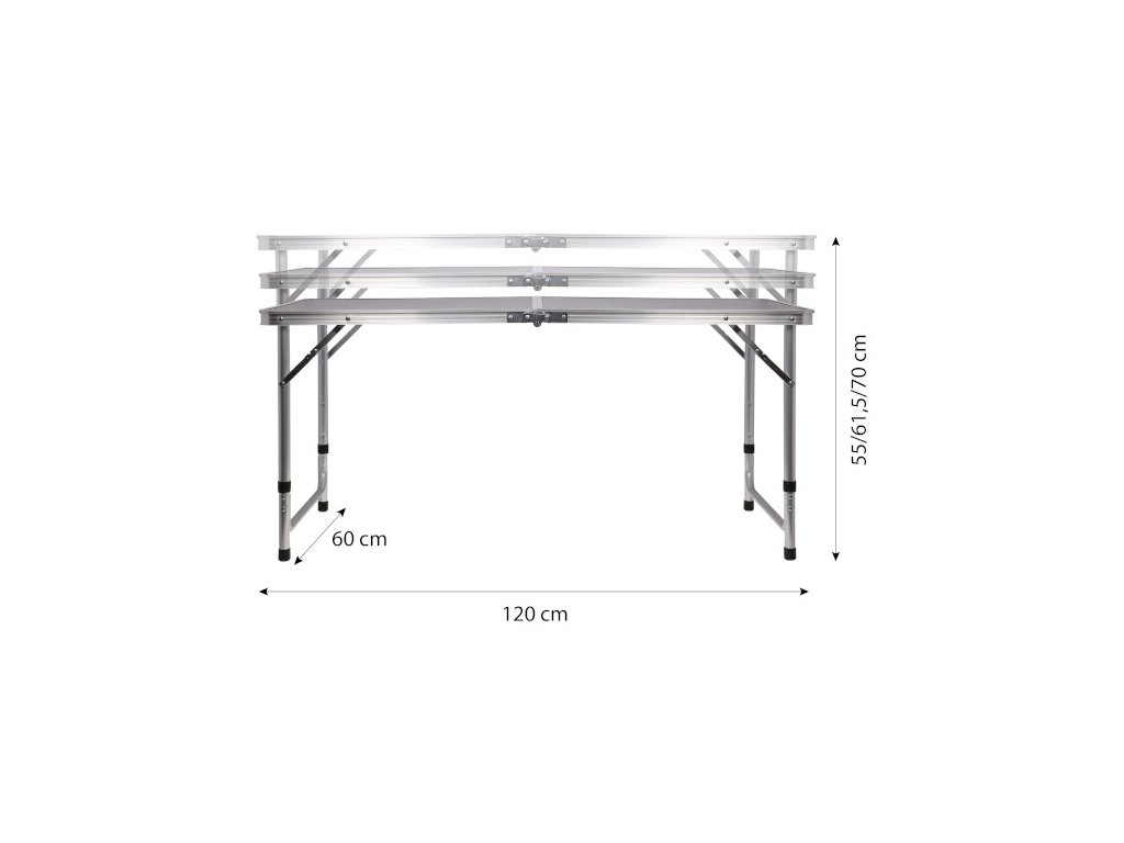 Pevná konštrukcia stola je vyrobená z hliníka. Doska stola má rozmery 120 x 60 cm a je vyrobená z laminovanej drevovláknitej dosky (MDF), ktorá sa ľahko udržiava v čistote. Výšku stola možno nastaviť do 3 úrovní (55 - 61,5 - 70 cm), takže nezáleží na tom, či pri stole sedia dospelí alebo skupina detí. Ak chcete stôl zložiť, je potrebné sklopiť nohy a stôl sa potom "zloží" na polovicu. Stôl sa zloží do "kufríka" s rozmermi 60 x 60 x 6,5 cm. Na jednoduché prenášanie je jeden okraj stolíka vybavený praktickým držadlom.