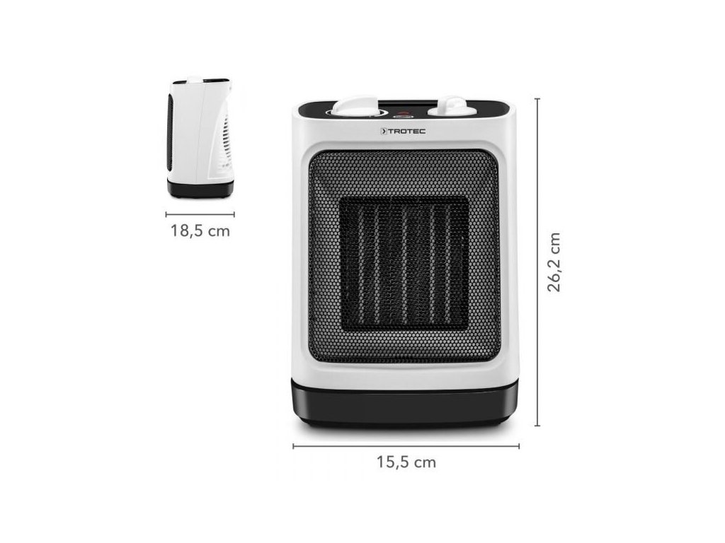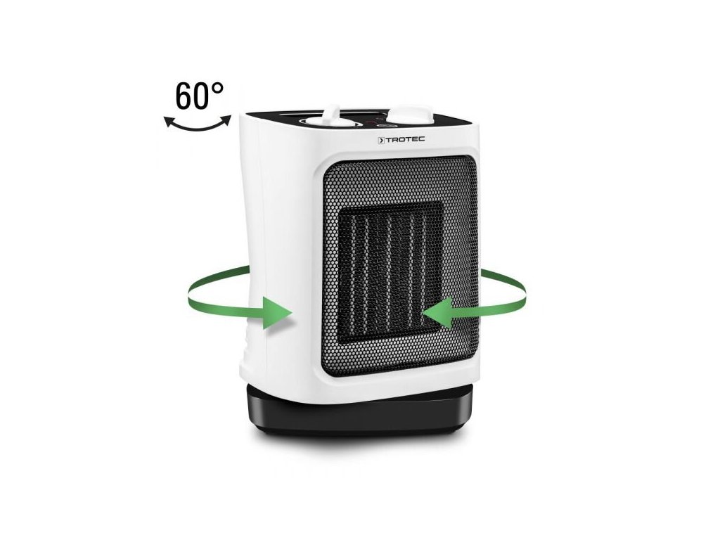 Vďaka dvom prepínateľným úrovniam vykurovania (1 200 W / 2 000 W) a plynulo nastaviteľnému termostatu sa keramický ventilátorový ohrievač TFC 17 E odporúča ako výkonný prídavný ohrievač pre takmer akékoľvek miesto v domácnosti alebo v kancelárií. Či už v obývacej izbe, spálni alebo detskej izbe: všade tam, kde sa potrebujete rýchlo a spoľahlivo zahriať, ohrievač ventilátora TFC 17 E s moderným keramickým ohrievačom PTC poskytuje teplo riadené termostatom. Ak dôjde k prekročeniu nastavenej hodnoty teploty, ohrev ventilátora sa úplne automaticky vypne. Ak teplota klesne pod cieľovú teplotu, prístroj sa automaticky znovu zapne. Na vykurovanie väčších plôch miestnosti má prístroj tiež prepínateľné 60 ° kmitanie na distribúciu teplého vzduchu po miestnosti.