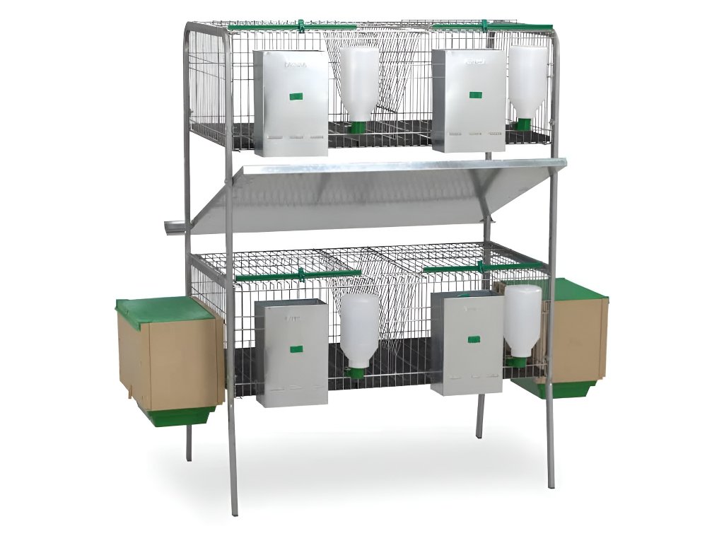 Koterec pre králiky Laguna - dvojposchodový koterec so 4 kotercami - s plastovou podlahou. 2 koterce sú pre samcov, 2 koterce sú pre samice, vrátane 2 plastových brlohov, dvojmiestnych automatov na kŕmenie, jaslí na seno a napájačiek s fľašou.