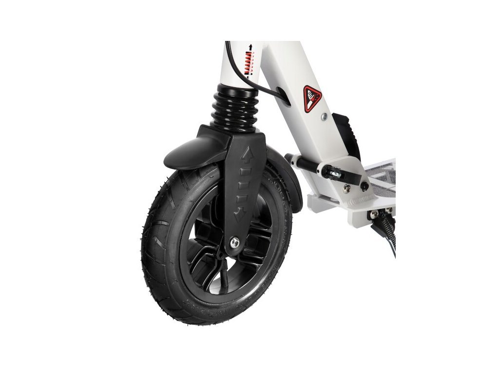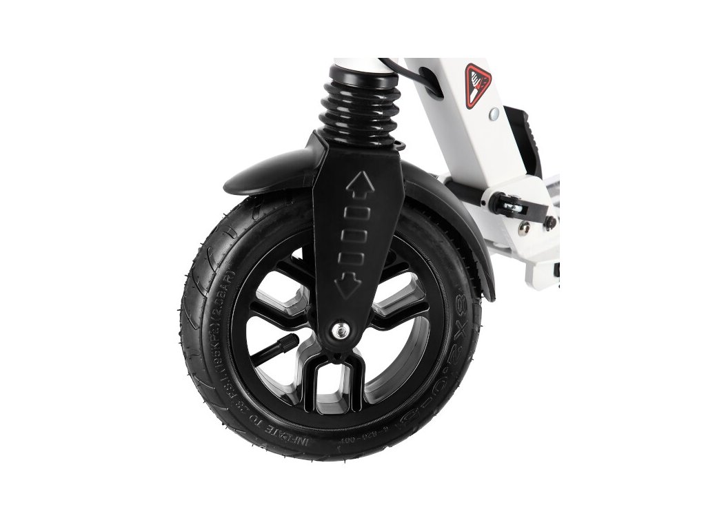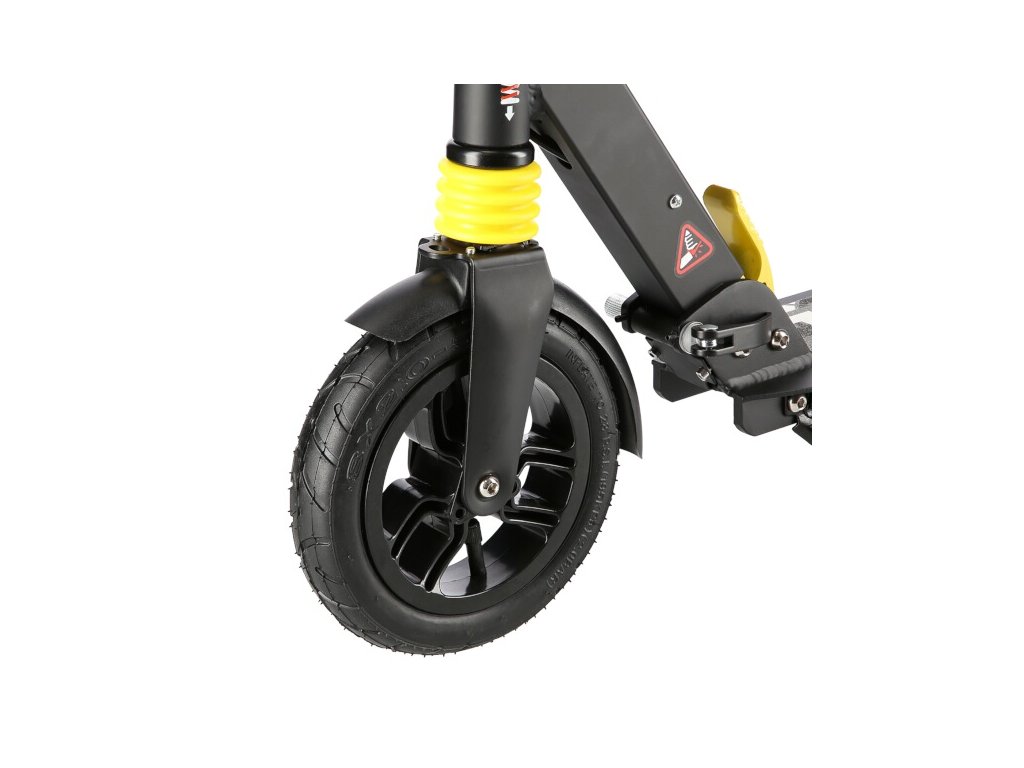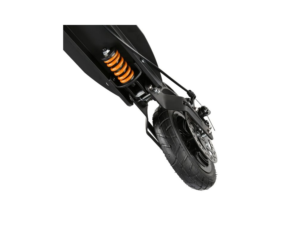 Systém odpruženia na oboch kolesách zvyšuje komfort jazdy. Tlmiče pohlcujú nárazy a spríjemňujú a uľahčujú jazdu na nerovnom asfalte alebo dlažbe. Robustný zadný blatník slúži ako prítlačná brzda, ktorá zvyšuje brzdný účinok disku. Samotný kotúč je brzdený jedným piestom, ktorý je mechanicky ovládaný lankom z páky na riadidlách, ktoré sú vybavené gumovými rukoväťmi na zabezpečenie pevného a pohodlného úchopu. Veľké kolesá sú vybavené ložiskami ABEC 9 a pumpovanými pneumatikami s priemerom 200 milimetrov. Táto kombinácia zaručuje rýchlu, plynulú a bezpečnú jazdu. Okrem toho pumpované pneumatiky spolupracujú s tlmičmi a tiež absorbujú nerovnosti povrchu. Blatník na prednom kolese a sklápací stojan sú len čerešničkou na torte, ktorá prispieva k maximálnemu možnému komfortu jazdy a celkovému pôžitku zo samotného modelu MH208T.