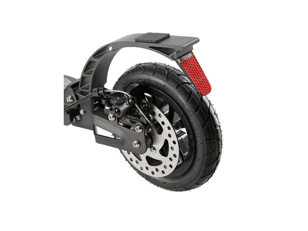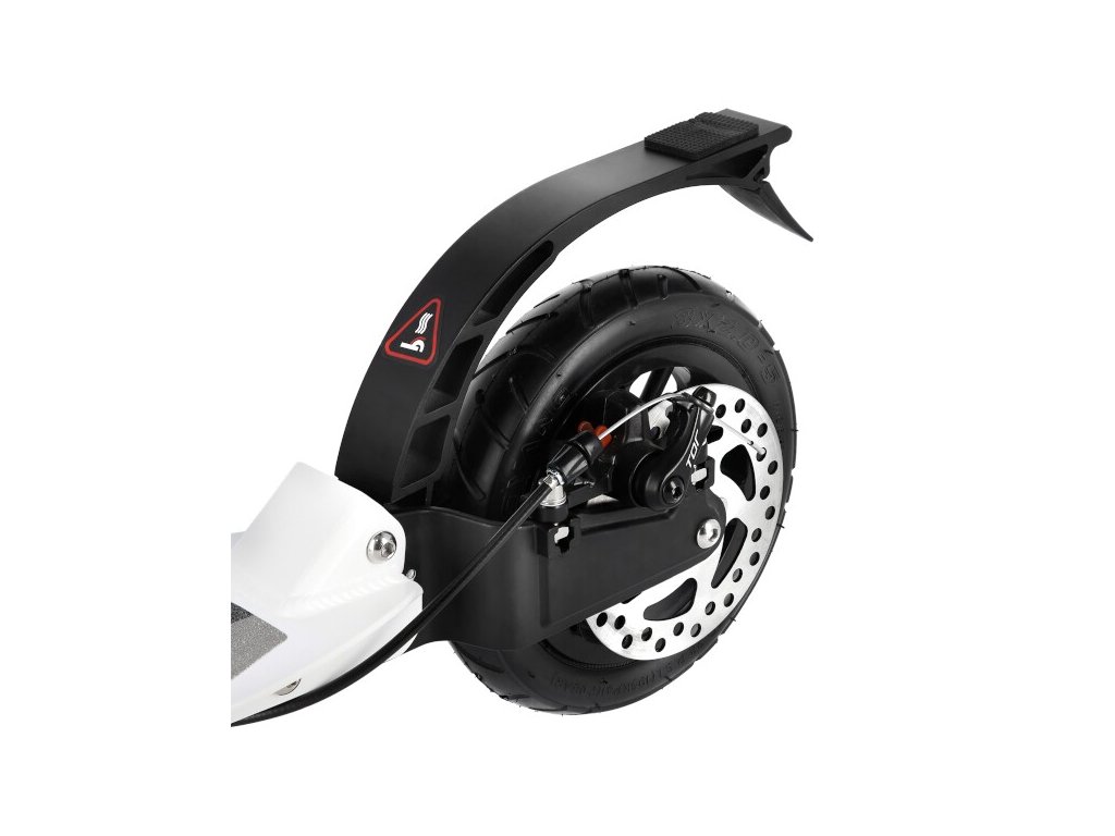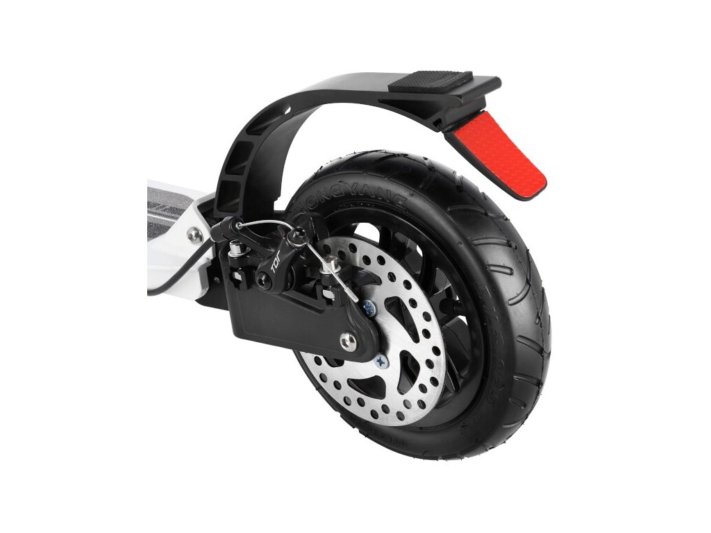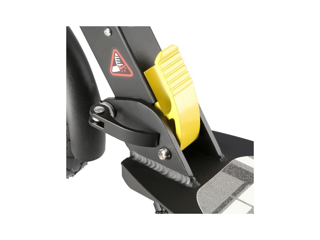Systém odpruženia na oboch kolesách zvyšuje komfort jazdy. Tlmiče pohlcujú nárazy a spríjemňujú a uľahčujú jazdu na nerovnom asfalte alebo dlažbe. Robustný zadný blatník slúži ako prítlačná brzda, ktorá zvyšuje brzdný účinok disku. Samotný kotúč je brzdený jedným piestom, ktorý je mechanicky ovládaný lankom z páky na riadidlách, ktoré sú vybavené gumovými rukoväťmi na zabezpečenie pevného a pohodlného úchopu. Veľké kolesá sú vybavené ložiskami ABEC 9 a pumpovanými pneumatikami s priemerom 200 milimetrov. Táto kombinácia zaručuje rýchlu, plynulú a bezpečnú jazdu. Okrem toho pumpované pneumatiky spolupracujú s tlmičmi a tiež absorbujú nerovnosti povrchu. Blatník na prednom kolese a sklápací stojan sú len čerešničkou na torte, ktorá prispieva k maximálnemu možnému komfortu jazdy a celkovému pôžitku zo samotného modelu MH208T.