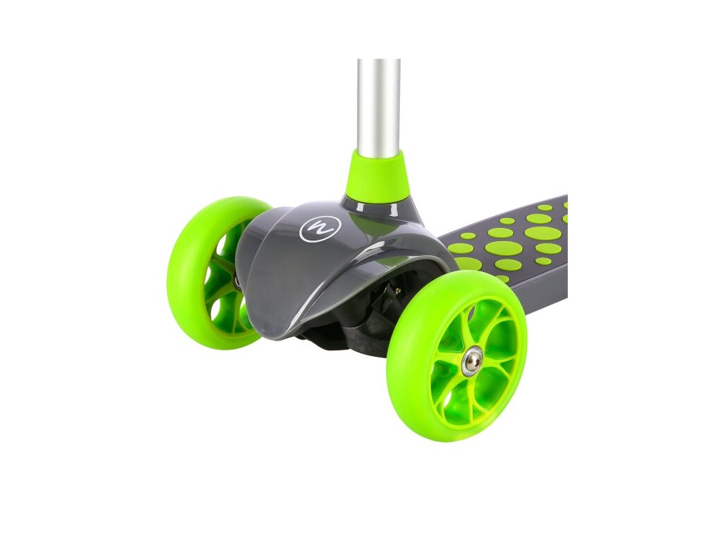 Tri kolieska zaručujú vysokú stabilitu. Teleskopické riadidlá sú stabilné a slúžia predovšetkým na udržanie rovnováhy. Manévrovanie sa vykonáva prenášaním hmotnosti na jednu alebo druhú stranu. Vďaka riadeniu s prenášaním hmotnosti je kolobežka maximálne bezpečná a nedochádza k jej prevráteniu. Rukoväte na riadidlách sú vyrobené z gumy na bezpečné uchopenie. Konce rukovätí sú vybavené zarážkou, ktorá zabraňuje skĺznutiu dlane z rukoväte a zároveň chráni dlaň, ak dieťa náhodou narazí riadidlami do prekážky - napríklad do fasády domu. Stupienok nie je pokrytý klasickým gripom, ale gumovou podložkou. Kolieska sú vybavené ložiskami ABEC 7 pre hladkú jazdu. Zadný blatník slúži ako nášľapná brzda na bezpečné zastavenie kolobežky.