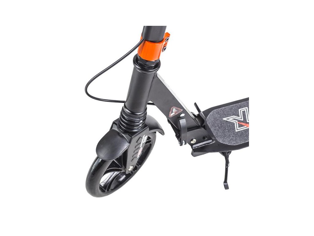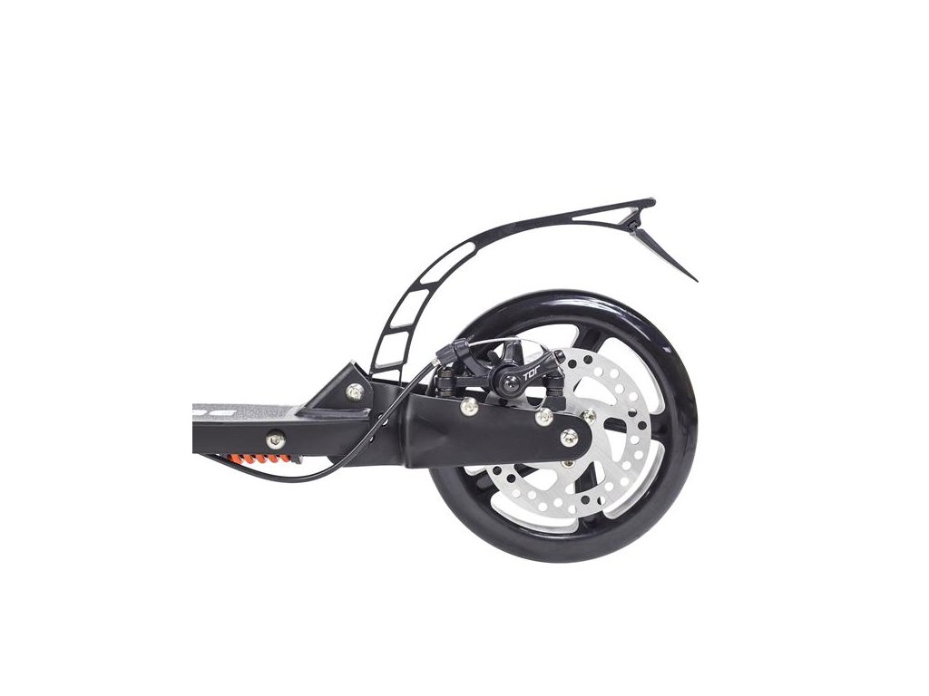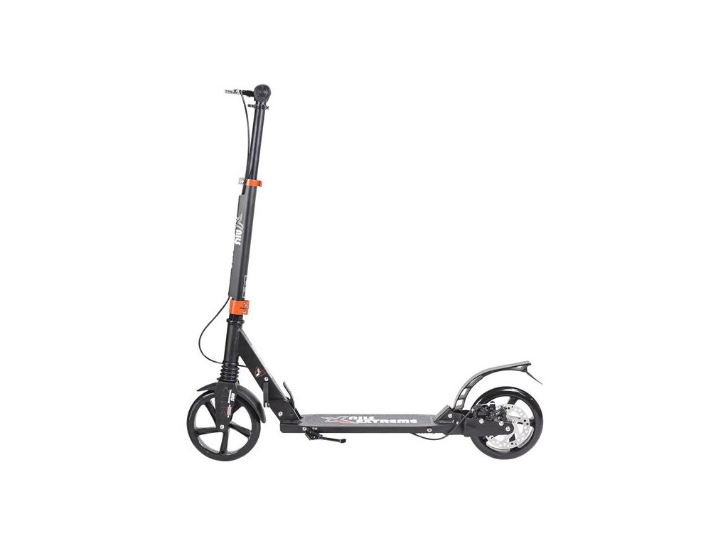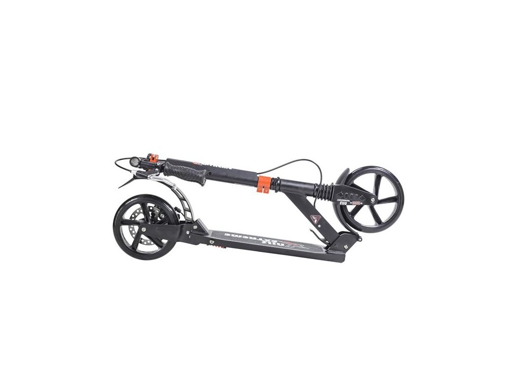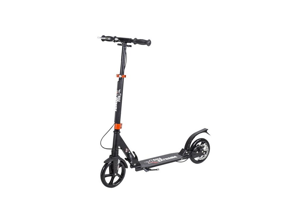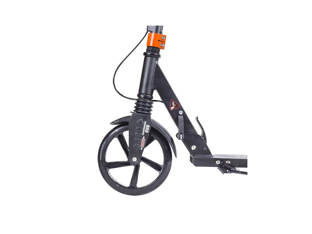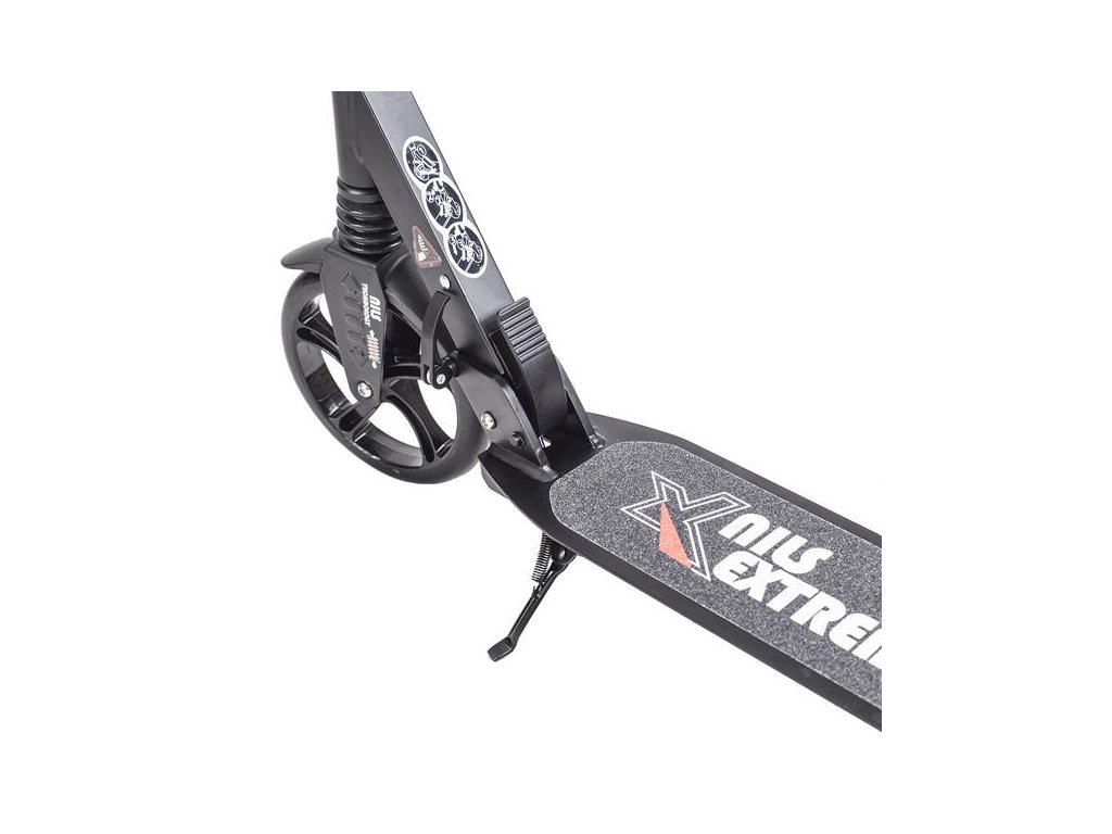Skladacia kolobežka značky NILS EXTREME HA200T je kolobežka určená pre celú rodinu. Charakteristickou vlastnosťou kolobežky sú dva tlmiče - predné zvislý a zadný vodorovný, zaisťujúci väčší komfort počas jazdy, minimalizujú drncání a pohlcujú otrasy. Vďaka tomu sa produkt dobre osvedčí pri prechádzaní nerovných povrchov. Široký a dlhý nášľap je pokrytý protišmykovým gripom zaisťujúcim správnu priľnavosť topánky. Nastaviteľná riadidlá (až do výšky 106 cm) umožňujú prispôsobiť kolobežku k výške dieťaťa alebo tiež zaisťujú pohodlnú jazdu dospelým osobám. Novo je tento model vybavený aj kotúčovou brzdou.
