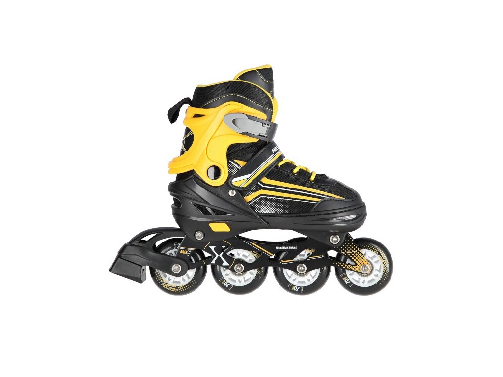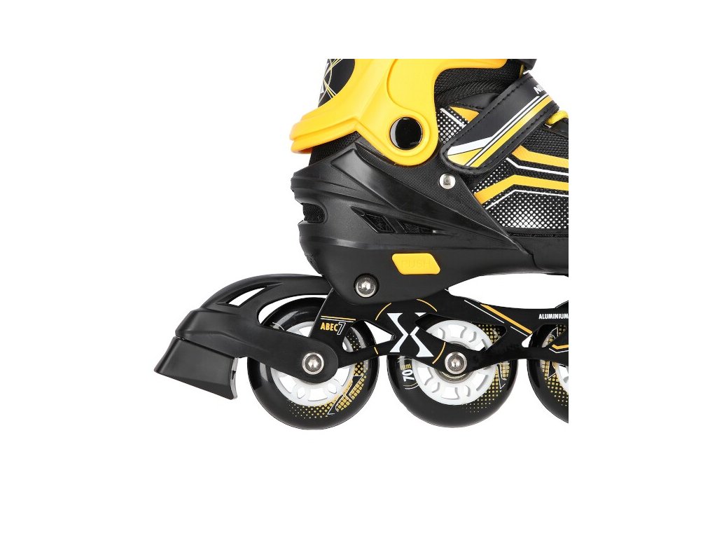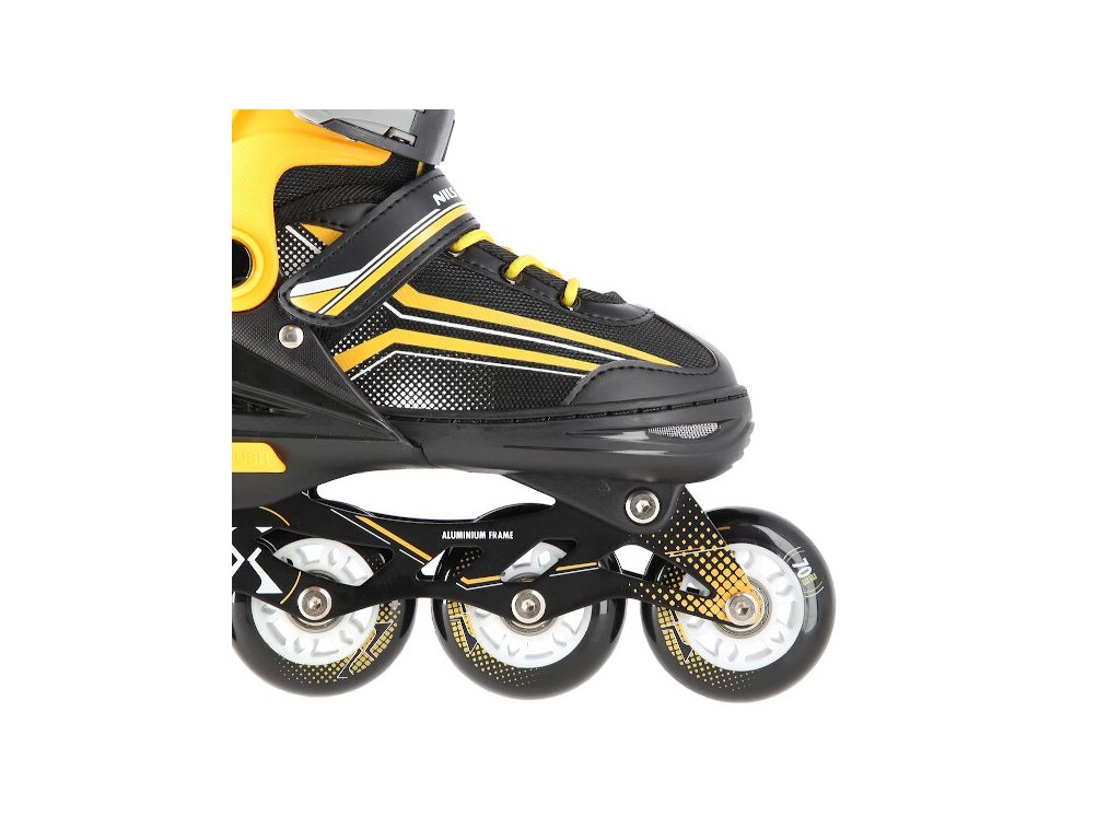 Hliníkový podvozok je osadený mäkkými PU kolieskami s ložiskami ABEC7 pre svižnú jazdu. Vonkajšia topánka je pomocou stlačenia tlačítka nastaviteľná do štyroch veľkosti. Toto riešenie umožňuje precízne prispôsobenie veľkosti podľa aktuálnych potrieb, alebo sa používa ako "rastúca topánka", ktorá "rastie" spolu s nohou dieťaťa. Na špičke sú ventilačné otvory pre maximálnu priedušnosť. Vnútorná topánka je vyrobená z kombinácie semišu, sieťoviny MESH, EVA a peny s vysokou hustotou. Zapínanie je riešené klasickou trojkombináciou - šnurovaním, remienkom so suchým zipsom a dvojsekčnou prackou. Súčasťou balenia je tiež pár nožov na ľad, ktoré sú vyrobené z nerez ocele s vysokým podielom uhlíka.