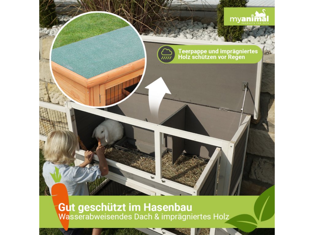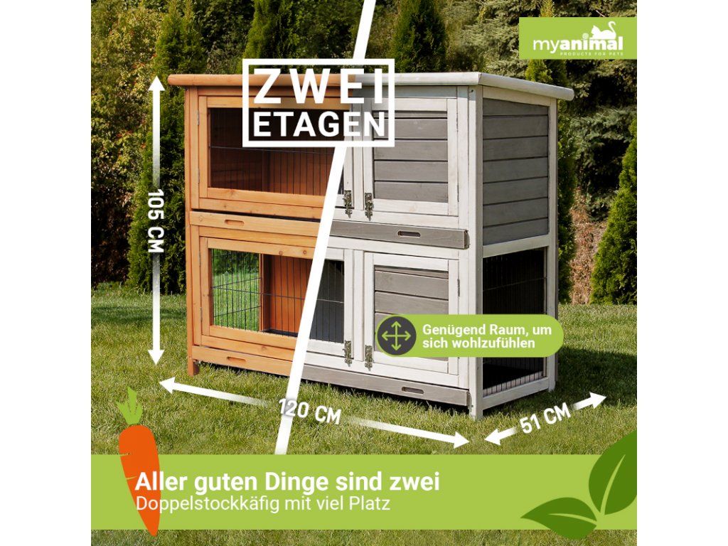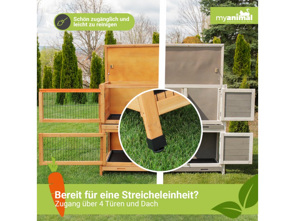 Králikáreň MyAnimal MH-20 ponúka milovanému ušatému králikovi dokonalé miesto, kde sa cíti dobre! Králikáreň s 2 poschodiami boduje veľkým priestorom. Vodoodpudivá strecha a impregnované drevo navyše robia králikáreň odolnou voči poveternostným vplyvom. Štyri dvere a otváracia strecha umožňujú prístup do interiéru dvojpodlažnej klietky. Čistenie je tiež hotové za okamih – vďaka dvom výsuvným zásuvkám.