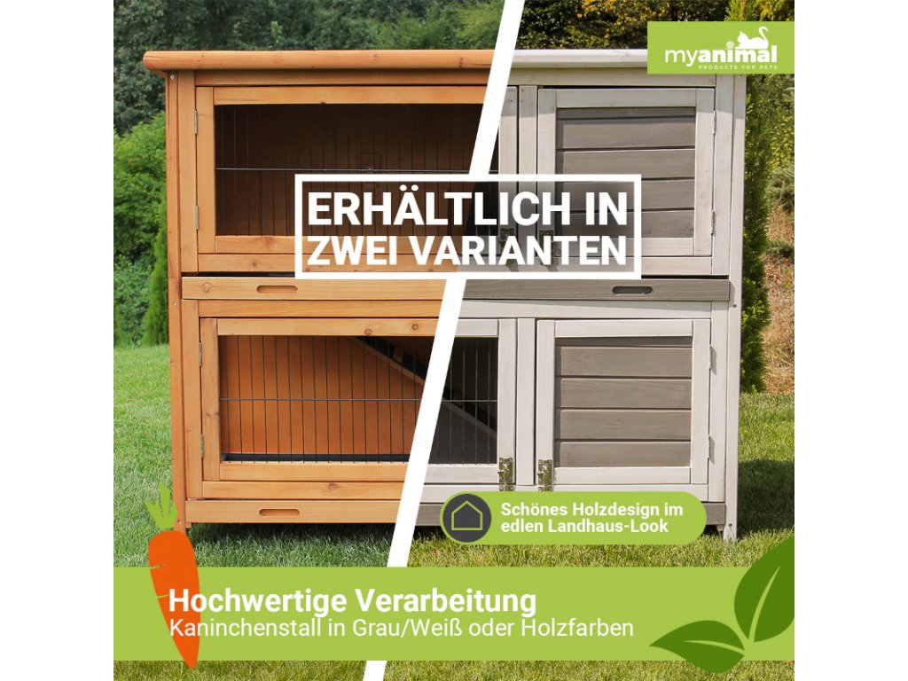 V MyAnimal Rabbit Hutch MH-20 nájde králik svoje osobné miesto, kde sa cíti dobre! Dôležité aj pre vás: Králikáreň by mala opticky ladiť s vašou záhradou. Preto je klietka pre králiky dostupná v krásnom drevenom prevedení alebo v prírodnom vidieckom vzhľade vo farbách sivá a biela.