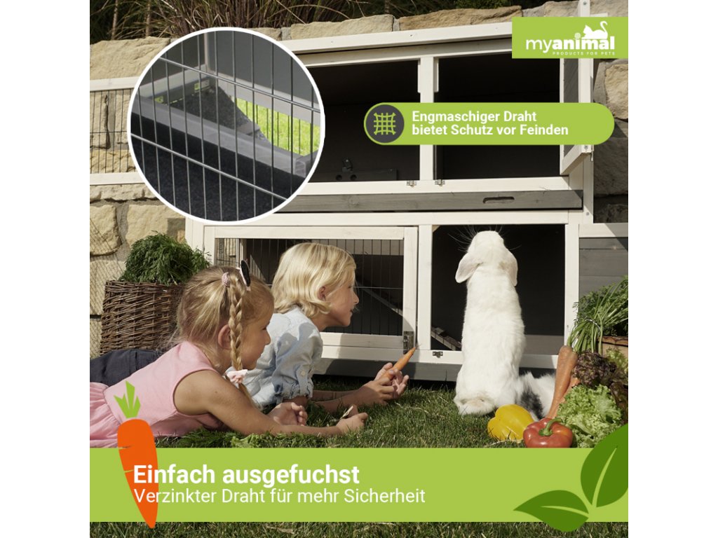Pozinkovaný drôt je úhľadne zapracovaný do kvalitného dreva králikárne MyAnimal MH-20. Králikovi tak umožňuje dostatočnú voľnosť pohybu, no zároveň ochranu a bezpečnosť pred predátormi.