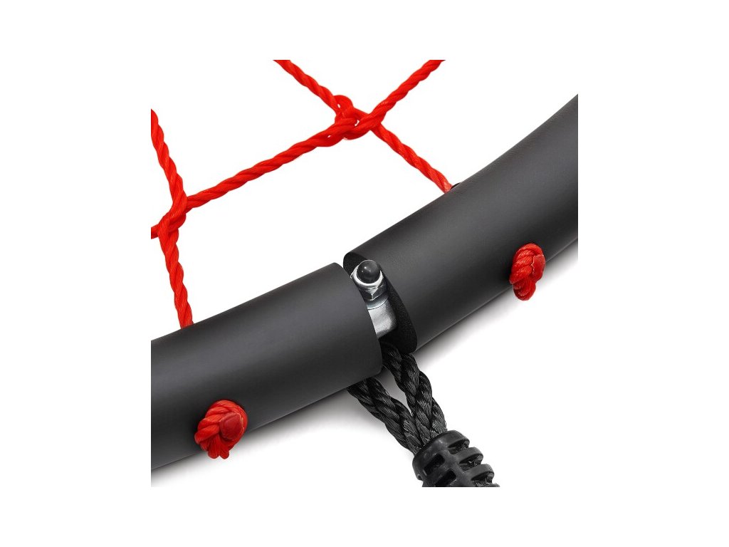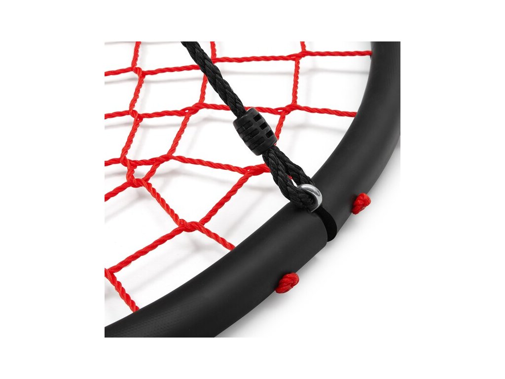 Rám s priemerom 100 centimetrov je vyrobený z oceľovej guľatiny s priemerom 25 milimetrov, na ktoré je pre maximálne bezpečie nalepená vysoká vrstva PE peny. Polyetylénový výplet modelu NB5038 má priemer 5 milimetrov a je maximálne odolný voči poškodeniu a poveternostným vplyvom ako je dážď a sneh, hniezdo tak nemusíte schovávať keď práve začne pršať. Nosná, polyetylénová lanká majú priemer 10 milimetrov a dĺžku 180 cm. Keď tieto vlastnosti skombinujeme tak získame priestrannú hojdačku s nosnosťou 150 kilogramov, na ktoré sa vybláznia aj viac detí naraz.