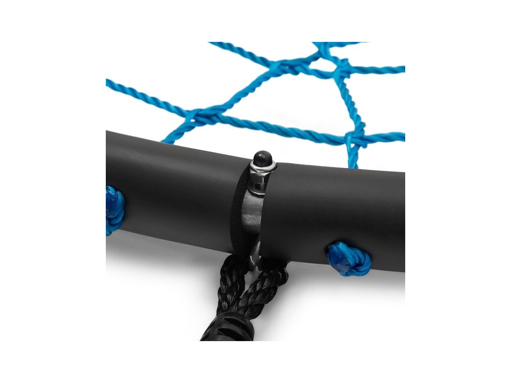 Rám s priemerom 100 centimetrov je vyrobený z oceľovej guľatiny s priemerom 25 milimetrov, na ktoré je pre maximálne bezpečie nalepená vysoká vrstva PE peny. Polyetylénový výplet modelu NB5038 má priemer 5 milimetrov a je maximálne odolný voči poškodeniu a poveternostným vplyvom ako je dážď a sneh, hniezdo tak nemusíte schovávať keď práve začne pršať. Nosná, polyetylénová lanká majú priemer 10 milimetrov a dĺžku 180 cm. Keď tieto vlastnosti skombinujeme tak získame priestrannú hojdačku s nosnosťou 150 kilogramov, na ktoré sa vybláznia aj viac detí naraz.