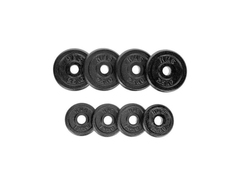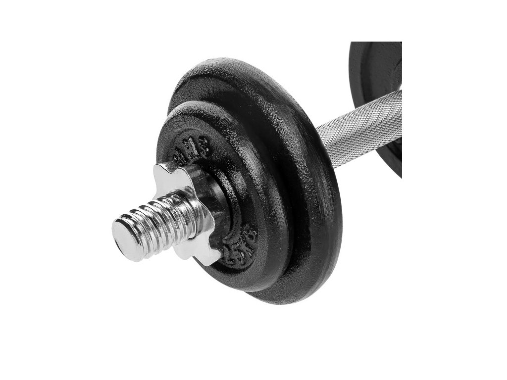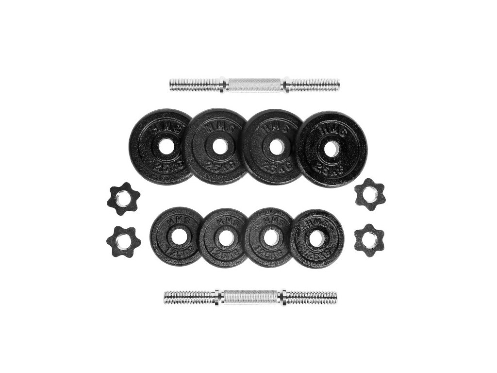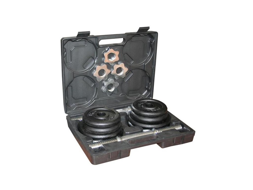 Sada jednoručných činiek v kufríku. Kufrík obsahuje 2 jednoručné hriadele, sadu čiernych kotúčov. 4 kusy matiek. Vďaka baleniu v plastovom uzatvárateľnom kufríku, možno činky jednoducho prenášať a skladovať.
