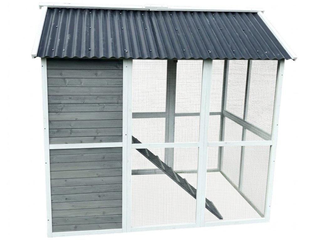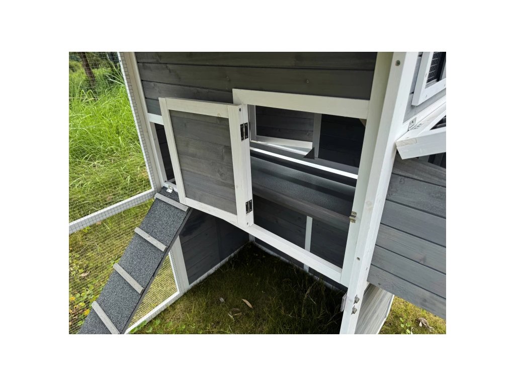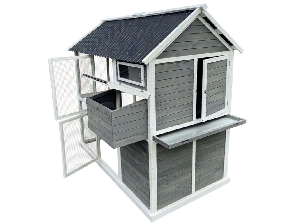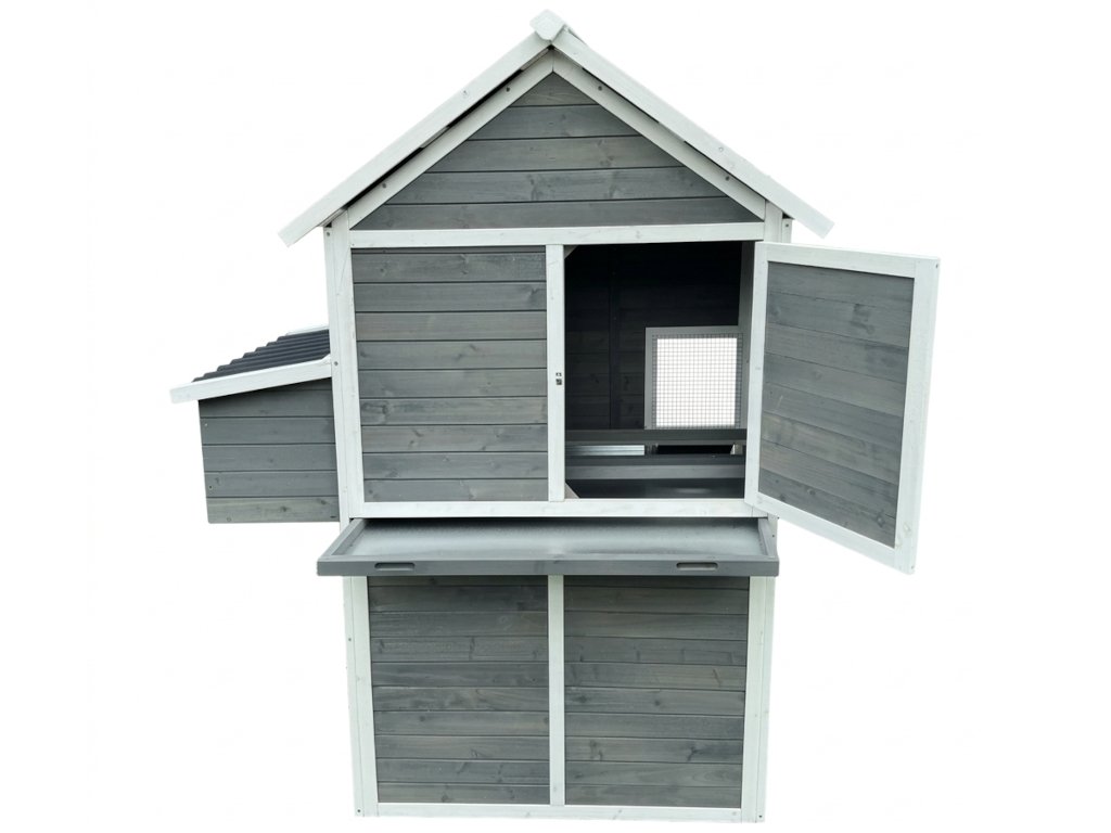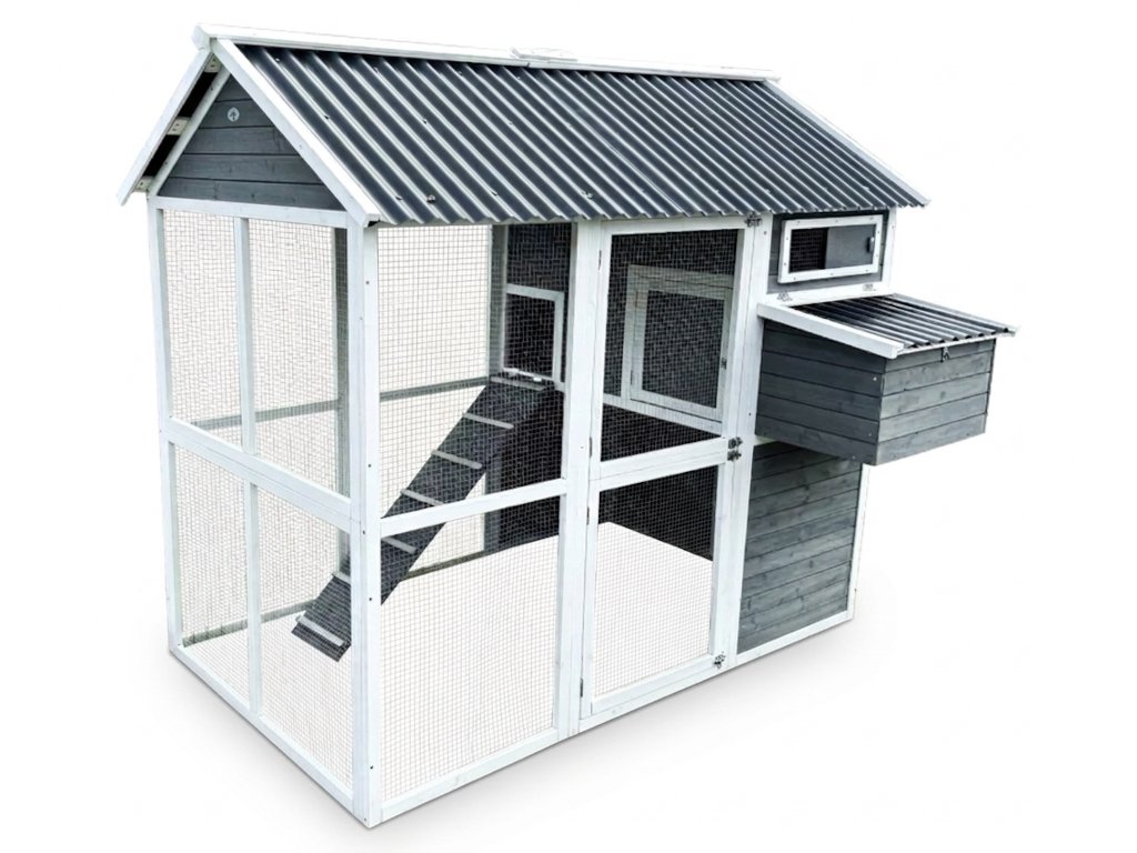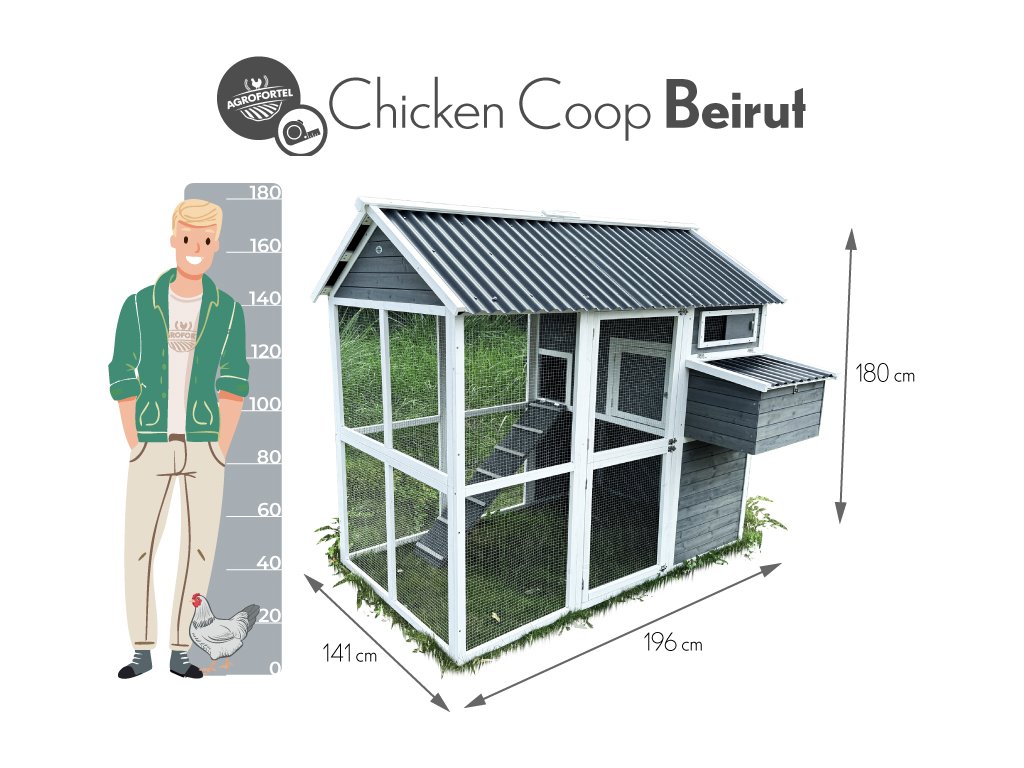 Kurník Bejrút je priestranný a elegantný prístrešok pre vaše sliepky. Spája kvalitu, bezpečie a štýl. S rozmermi 196 × 141 × 180 cm poskytuje domov až pre 6 sliepok. Steny kurníka sú z masívneho dreva v kombinácii šedej a bielej farby, materiál strechy je vlnitý plast, ktorý úplne bezpečne chráni pred dažďom, snehom i horúcim slnkom. Súčasťou je aj veľký oplotený výbeh z pozinkovaného pletiva, kde majú sliepky dostatok priestoru na pohyb na čerstvom vzduchu a tráve. Vnútri kurníka sa nachádza hrad pre nočný odpočinok, rampa spájajúca obytnú časť s výbehom a bočné znáškové hniezdo s výklopnou strechou pre ľahký zber vajíčok. Jednoduchú údržbu zaisťuje výsuvný trusník (výsuvná podlaha). Zdraviu vašich sliepočiek prospeje ventilačné okienko s pletivom, ktoré zaisťuje prístup čerstvého vzduchu, ktorý je pre správne životné podmienky úplne nevyhnutný. Prístup dovnútra kurníka je jednoduchý vďaka veľkým dvierkam na prednej aj zadnej strane a bočným dverám do výbehu.