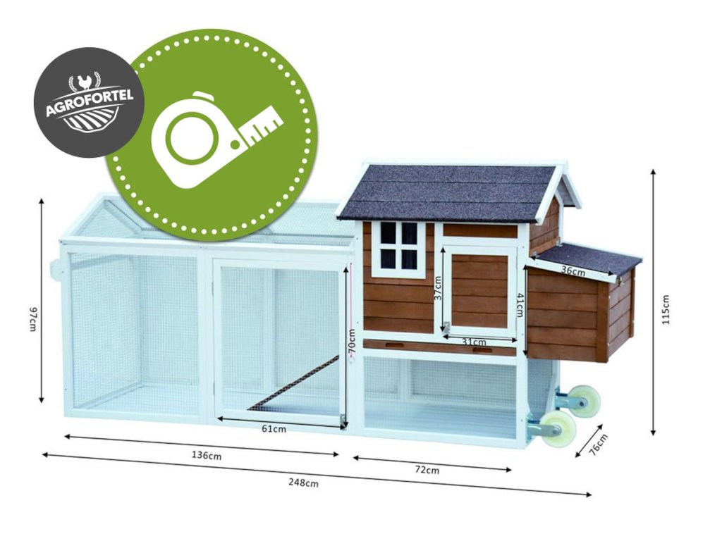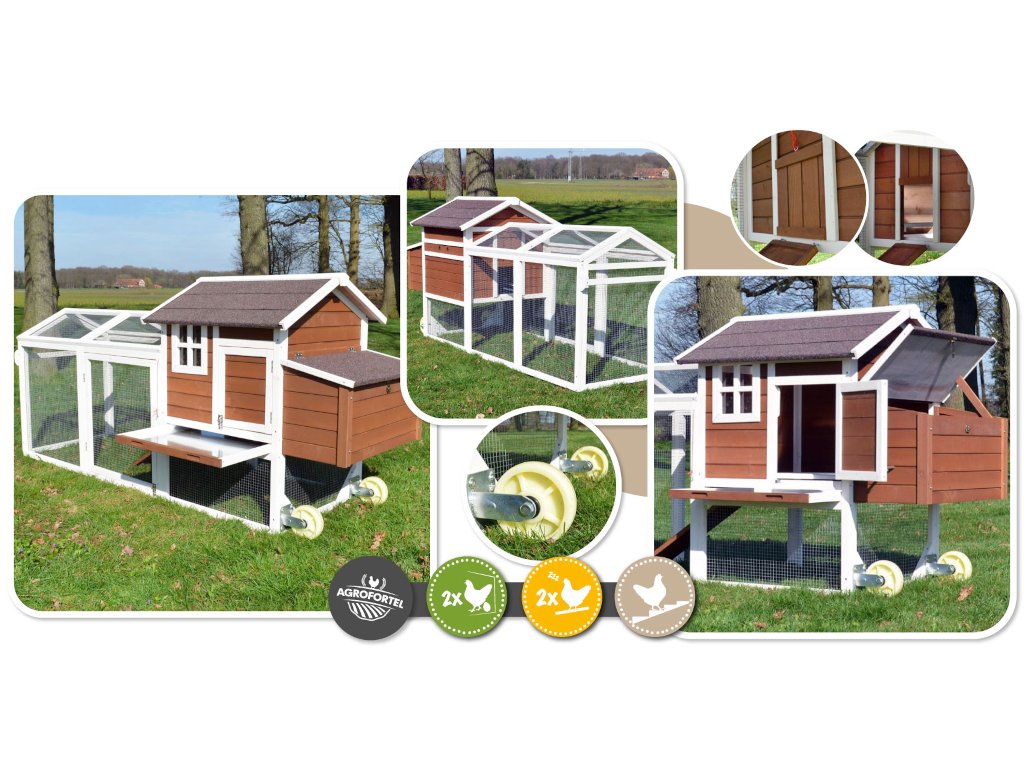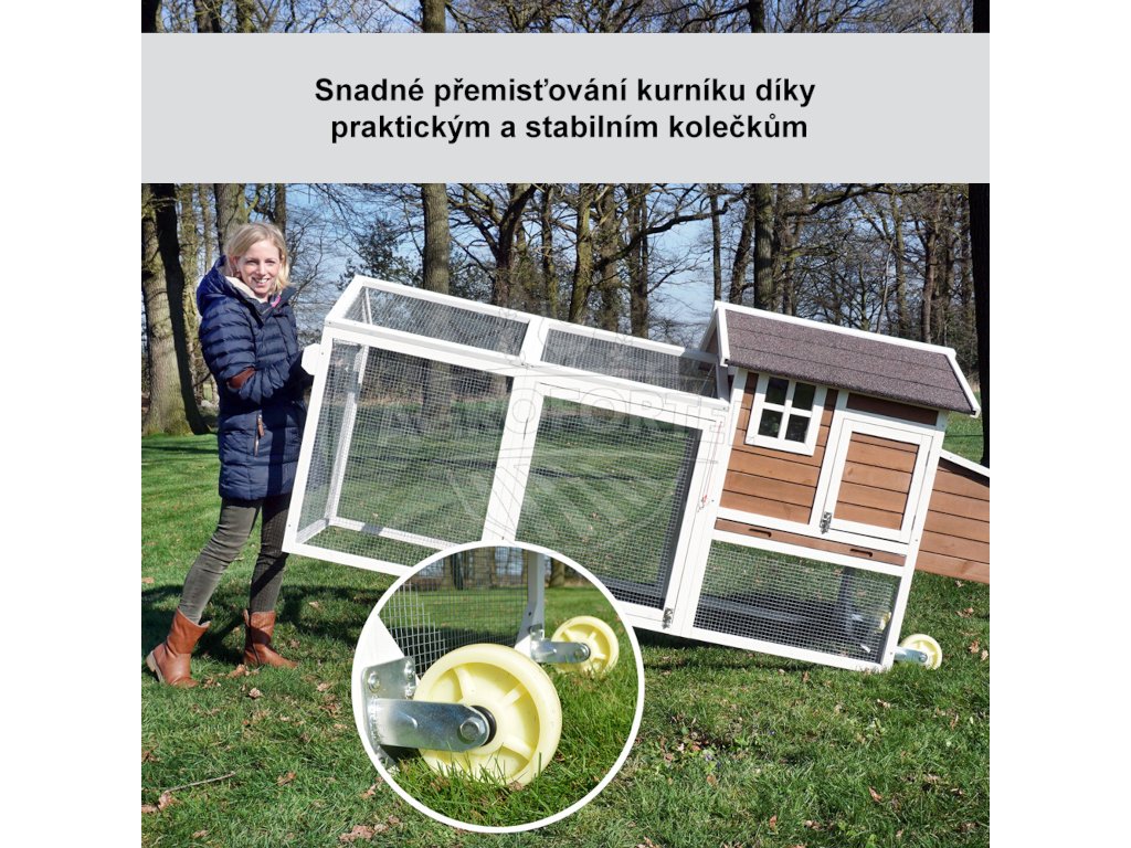 Tento drevený kurník spĺňa všetko, čo od neho Vy, aj vaši operenci vyžadujete - ponúka priestranný výbeh, rampu pre pohodlný prístup do obytnej časti, dvojité znáškové hniezdo, dva bidlá pre nočný odpočinok, presvetlený interiér a výsuvný trusník pre ľahkú údržbu. Navyše je vďaka praktickým kolieskam mobilné , takže Vaše sliepočky majú neustále čerstvú trávu na zobanie!