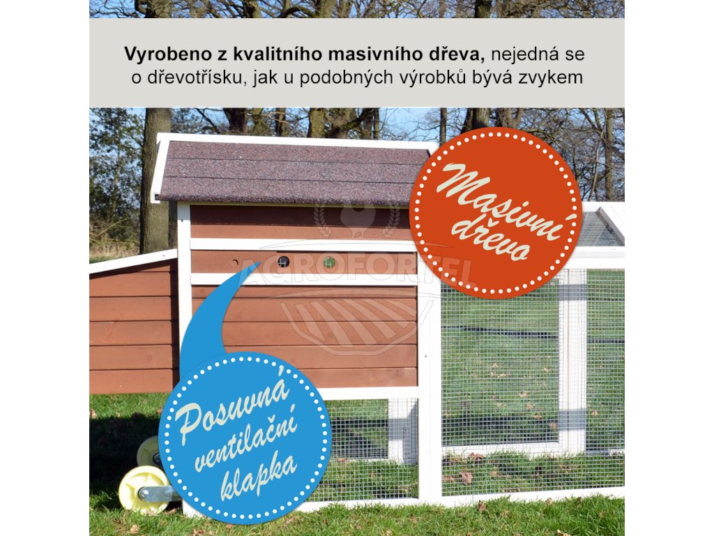 - konštrukcia z masívneho dreva: Predátori si na obyvateľa kurníka len tak neprídu - chránia ich totiž steny z masívneho dreva a pletivo z kvalitného pozinkovaného drôtu.