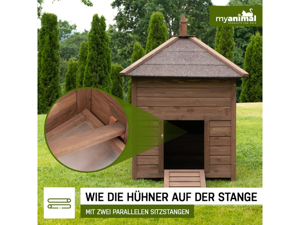 Dobre chránený kurník, akou je MyAnimal MH-11 výrazne prispieva k pohode vašich kurčiat. Kurník je vybavený dvoma paralelnými bidlami. Je tu teda dostatok miesta na to, aby sa hydina k sebe pritúlila a spokojne si pospala.