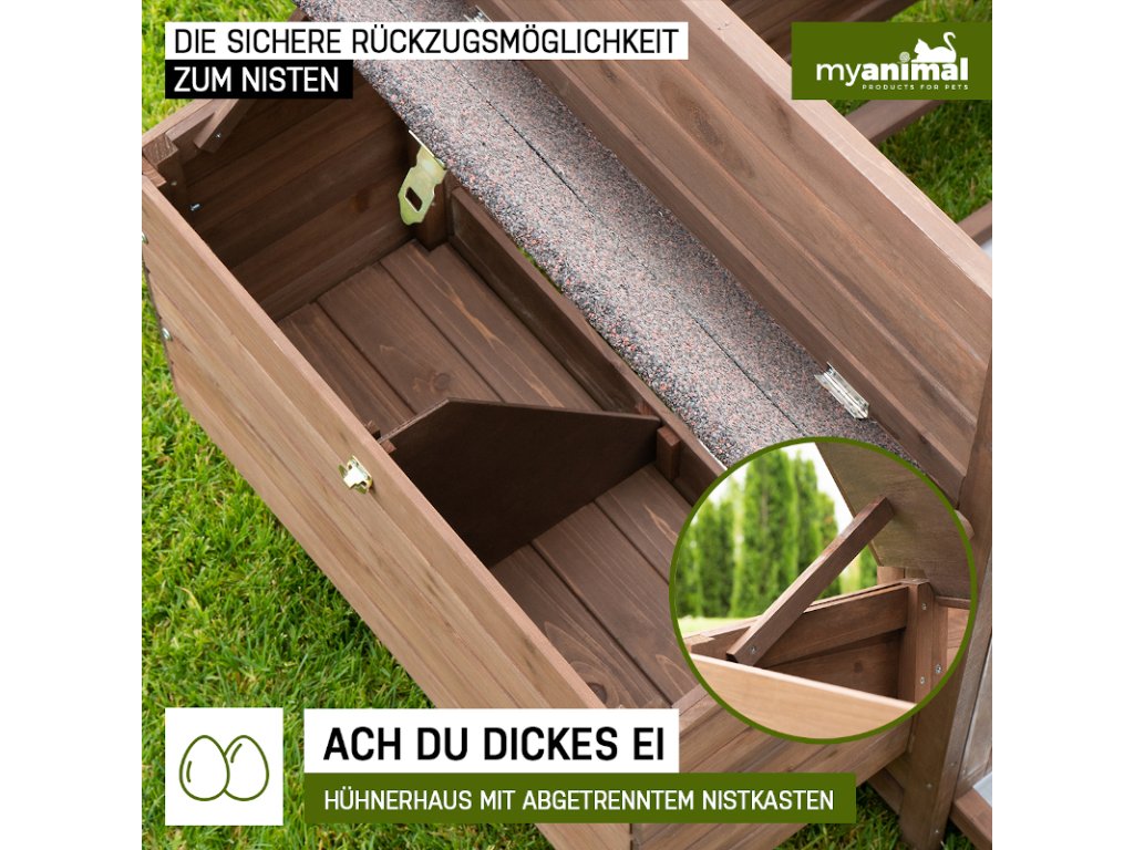 Kurník MyAnimal MH-11 vám ušetrí zdĺhavé hľadanie vajíčok. Kuracia voliéra je vybavená samostatnou hniezdnou búdkou. Vaše sliepky tu nájdu dve samostatné miesta na ploche 64 x 27 x 33 cm . Tu majú dostatok priestoru a súkromia, aby mohli v pokoji a pohode naklásť vajíčka. Stabilná strecha pokrytá asfaltovou lepenkou ich chráni pred poveternostnými vplyvmi.