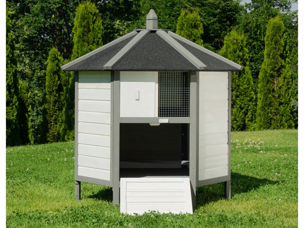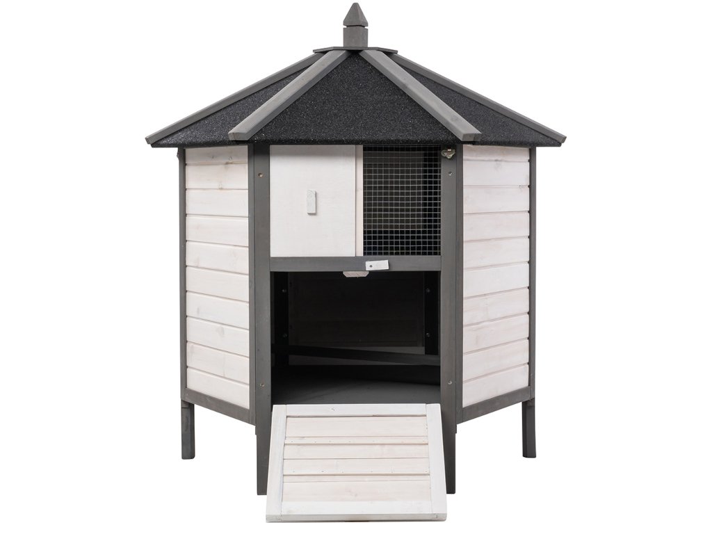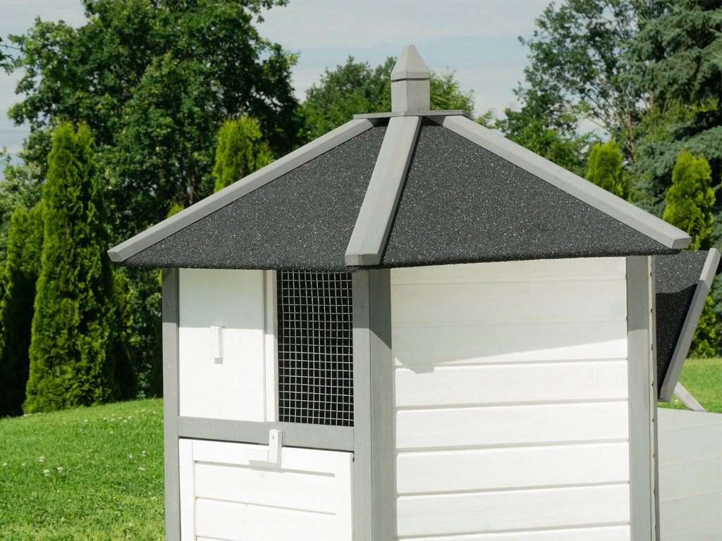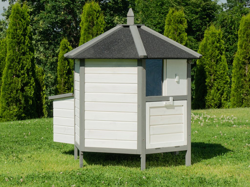 Kurník MyAnimal MH-29 na prvý pohľad zaujme svojim nevšedným vzhľadom. V 6-hrannom prevedení z robustného dreva v bielej a šedej farbe je kuracia voliéra ozdobou vášho pozemku. Okno s drôtenou mrežou na prednej strane prepúšťa svetlo a čerstvý vzduch. Dá sa jednoducho otvárať a zatvárať posúvačom. Pod oknom sú dvierka, ktoré vám umožňujú pustiť kurčatá von. Aby sa aj hydina cítila v kvalitnom kuríne bezpečne, je mierne vyvýšená na šiestich stĺpikoch.