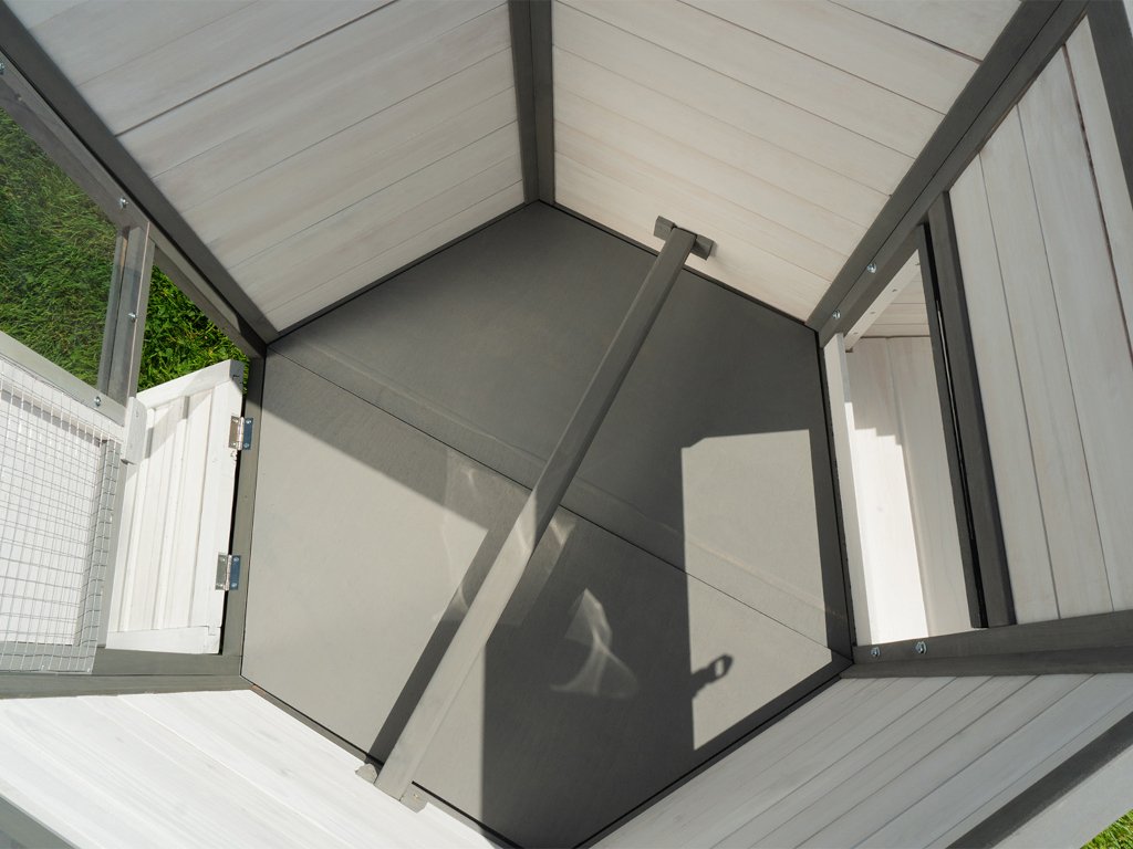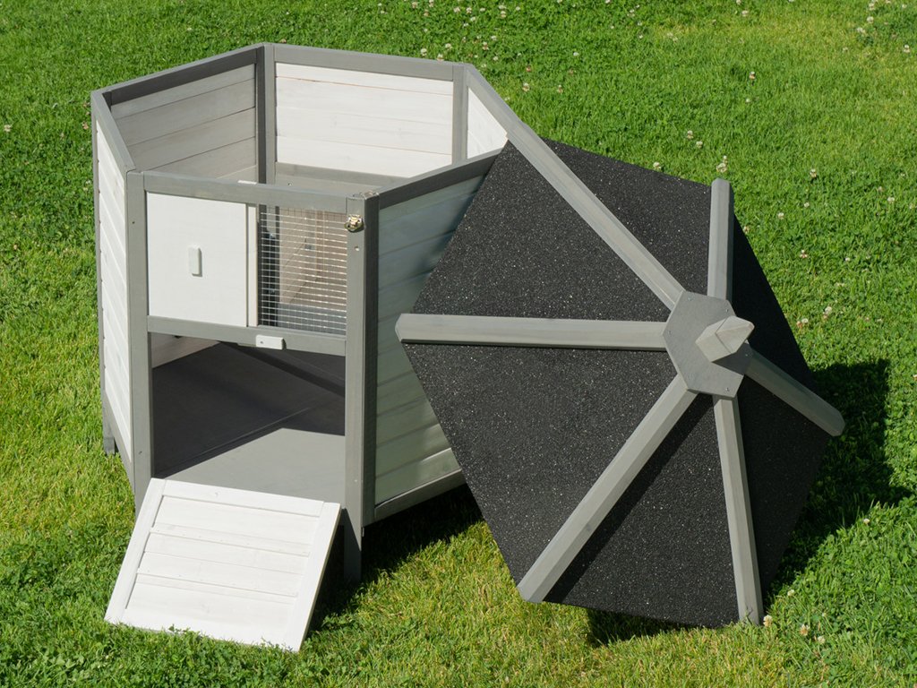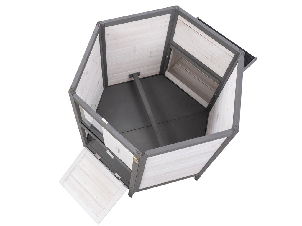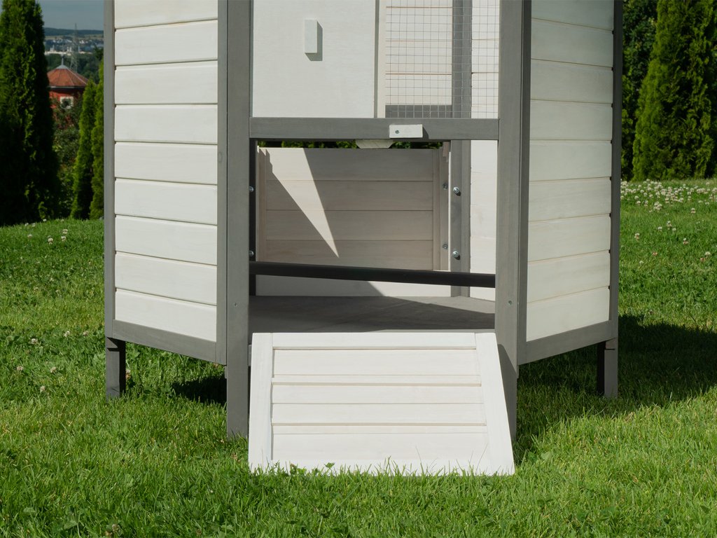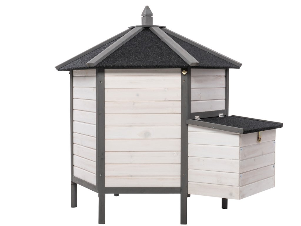 Kurník MyAnimal MH-29 na prvý pohľad zaujme svojim nevšedným vzhľadom. V 6-hrannom prevedení z robustného dreva v bielej a šedej farbe je kuracia voliéra ozdobou vášho pozemku. Okno s drôtenou mrežou na prednej strane prepúšťa svetlo a čerstvý vzduch. Dá sa jednoducho otvárať a zatvárať posúvačom. Pod oknom sú dvierka, ktoré vám umožňujú pustiť kurčatá von. Aby sa aj hydina cítila v kvalitnom kuríne bezpečne, je mierne vyvýšená na šiestich stĺpikoch.