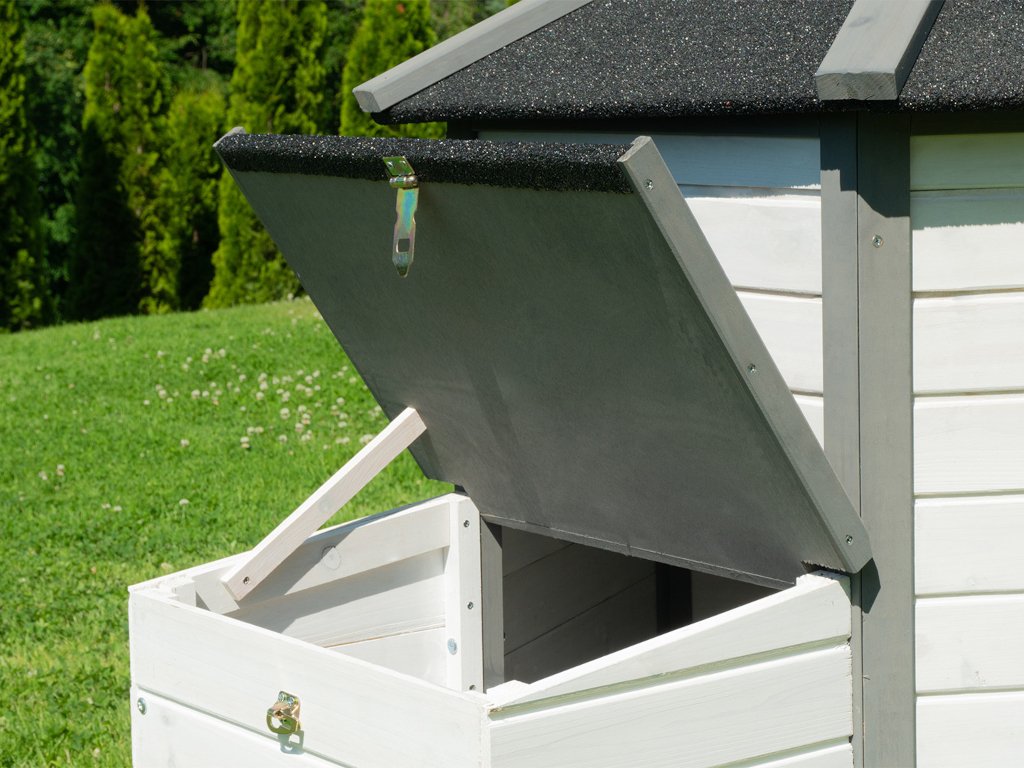 Chceli by ste svojej hydine dopriať čerstvý vzduch a slnečné lúče v kurníku? Potom jednoducho odstráňte strechu. "Topless" nielenže prináša veľa čerstvého vzduchu a svetla dovnútra, ale tiež vám umožní ľahko vyčistiť kuraciu voliéru. Zatiaľ čo sa vaše sliepky veselo škriabu po dvore, vy môžete v kľude a pokoji odstrániť hnoj a nečistoty. Konštrukcia strechy však nie je praktická len pri jasnom slnku: ak príde dažďová prehánka alebo začne snežiť, vodoodpudivá strešná lepenka ochráni hydinu pred vlhkosťou a studeným vetrom. Samozrejme aj strecha hniezdnej búdky je pokrytá pevnou asfaltovou lepenkou a ponúka vašim sliepkam spoľahlivú ochranu pred poveternostnými vplyvmi aj počas znášania vajec.