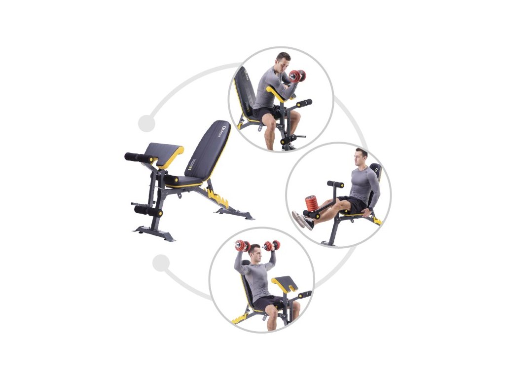 Opierka chrbta je nastaviteľná do 7 polôh a sedadlo do 3 polôh, v horizontálnej polohe môžete vykonávať väčšinu cvikov s činkami, predkopávať a zakopávať, ak sú opierka chrbta a sedadlo nastavené do záporného uhla, potom získame šikmú lavičku na posilňovanie brucha, na tento účel je možné upevniť aj rám predkopávania v 3 uhloch, operadlo v kladnom uhle slúži ako lavička pod veľkú činku alebo ako lavička na posilňovanie bicepsov.