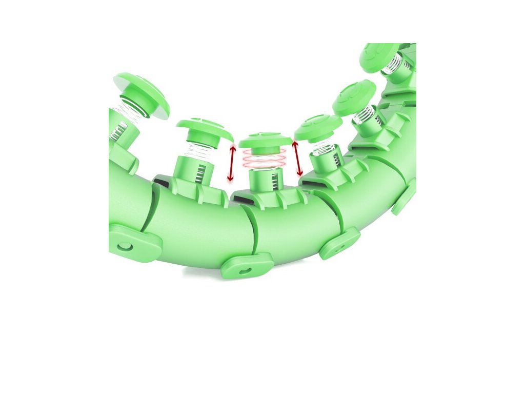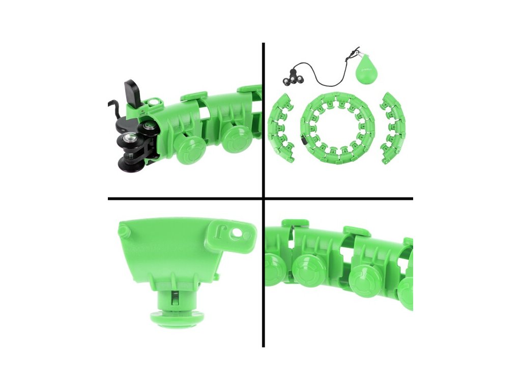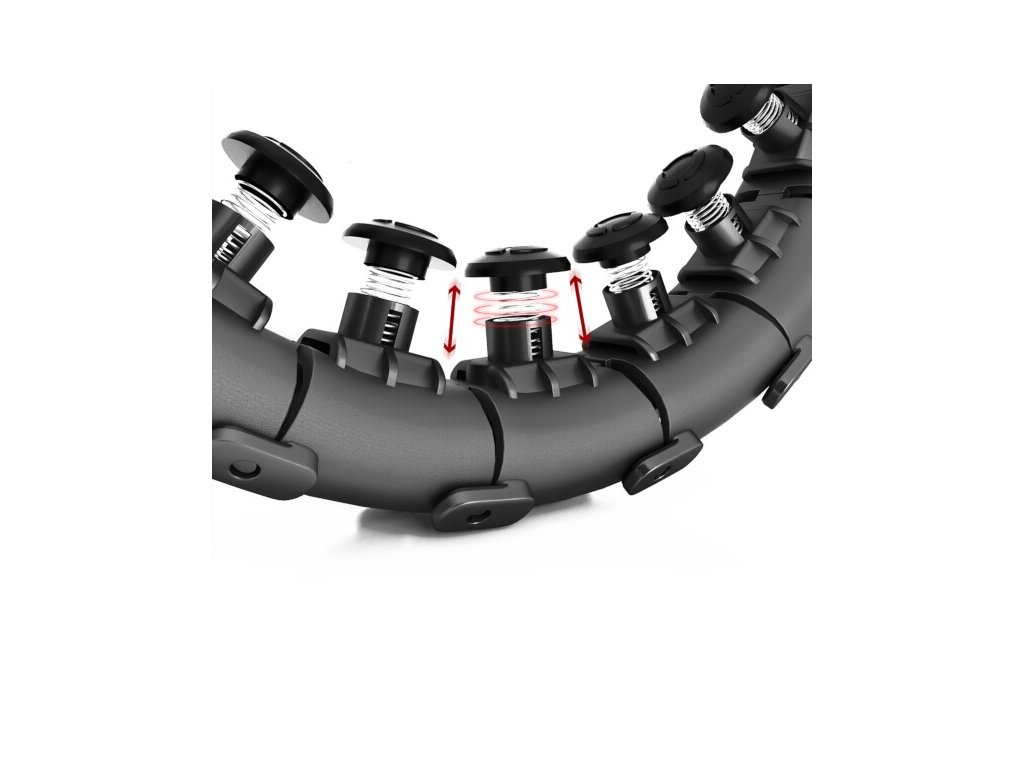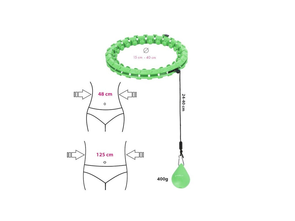 Dĺžka obruče sa nastavuje podľa obvodu pása tak, aby bola dostatočne voľná, ale zároveň neprepadávala cez boky. Po nastavení dĺžky sa obruč zaistí pomocou spojovacieho dielu, ktorý je vybavený páčkami na ovládanie zámku. Potom závažie "hodíme" v smere, v ktorom budeme krútiť bokmi, a začneme s tréningom. Obruč HHW12 je z vnútornej strany vybavená pružinovými masážnymi krytkami, ktoré tlmia vibrácie pohyblivej kotvy a zároveň príjemne masírujú oblasť pása. Intenzitu cvičenia ovplyvňuje dĺžka šnúry a rýchlosť, akou krútime bokmi.