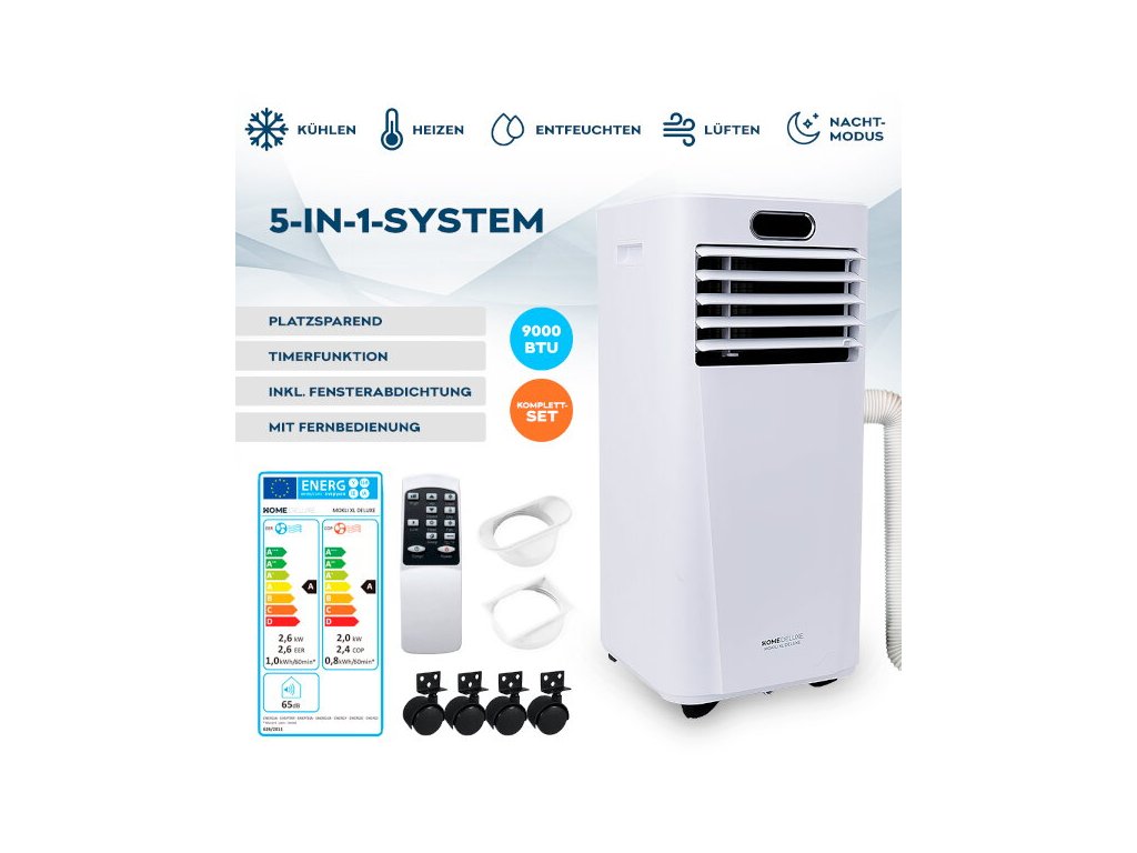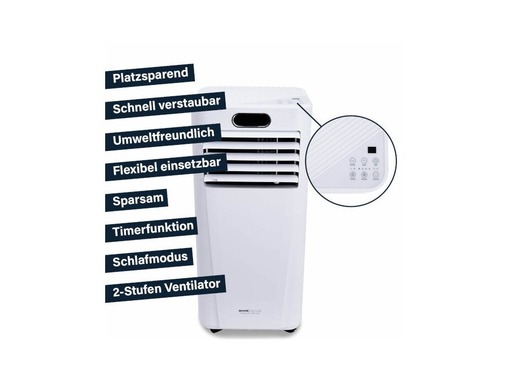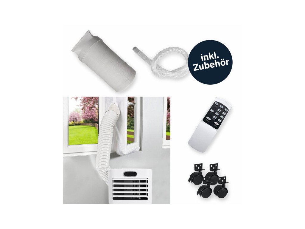 Mobilitu zariadenia zabezpečujú pohyblivé kolieska, takže je vždy pripravené na použitie tam, kde je najviac potrebné. Vďaka svojej kompaktnosti je klimatizácia priestorovo úsporná a ľahko skladovateľná. Flexibilná 150 cm hadica na vyfukovaný vzduch sa prispôsobí akémukoľvek prostrediu. Klimatizácia ponúka funkcie odvlhčovania a časovača, čo umožňuje inteligentnú reguláciu teploty, napríklad aj počas noci. Integrované filtre zabezpečujú čistenie vzduchu.
