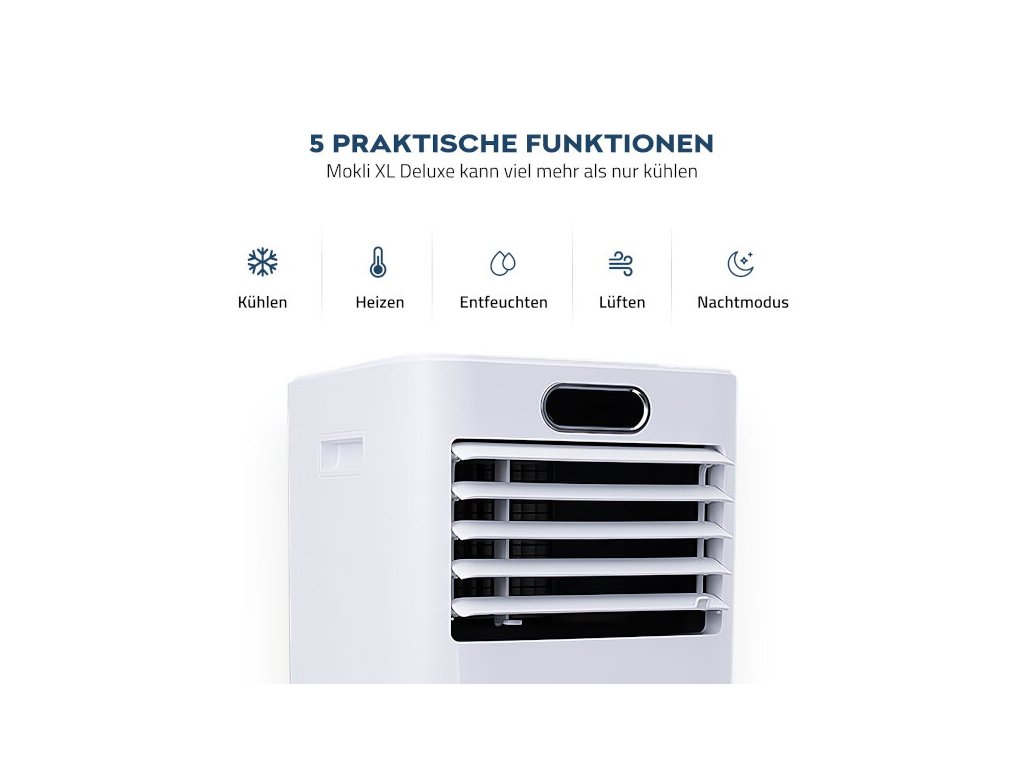 Klimatizácia Mokli DELUXE XL nielen chladí, ale tiež dokáže vykurovať malé miestnosti alebo podporovať existujúce vykurovanie, čím rýchlejšie zabezpečí príjemné teplo počas zimných dní. Funkcia ventilátora zabraňuje tvorbe plesní a nepríjemným zápachom.