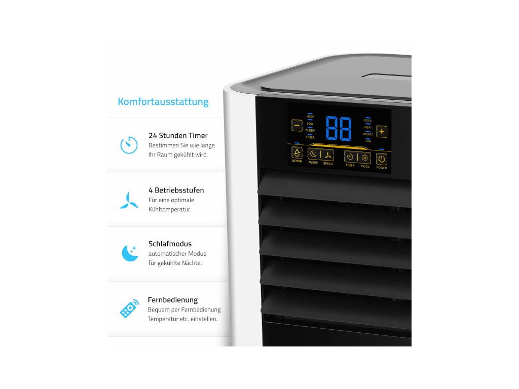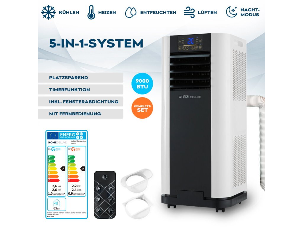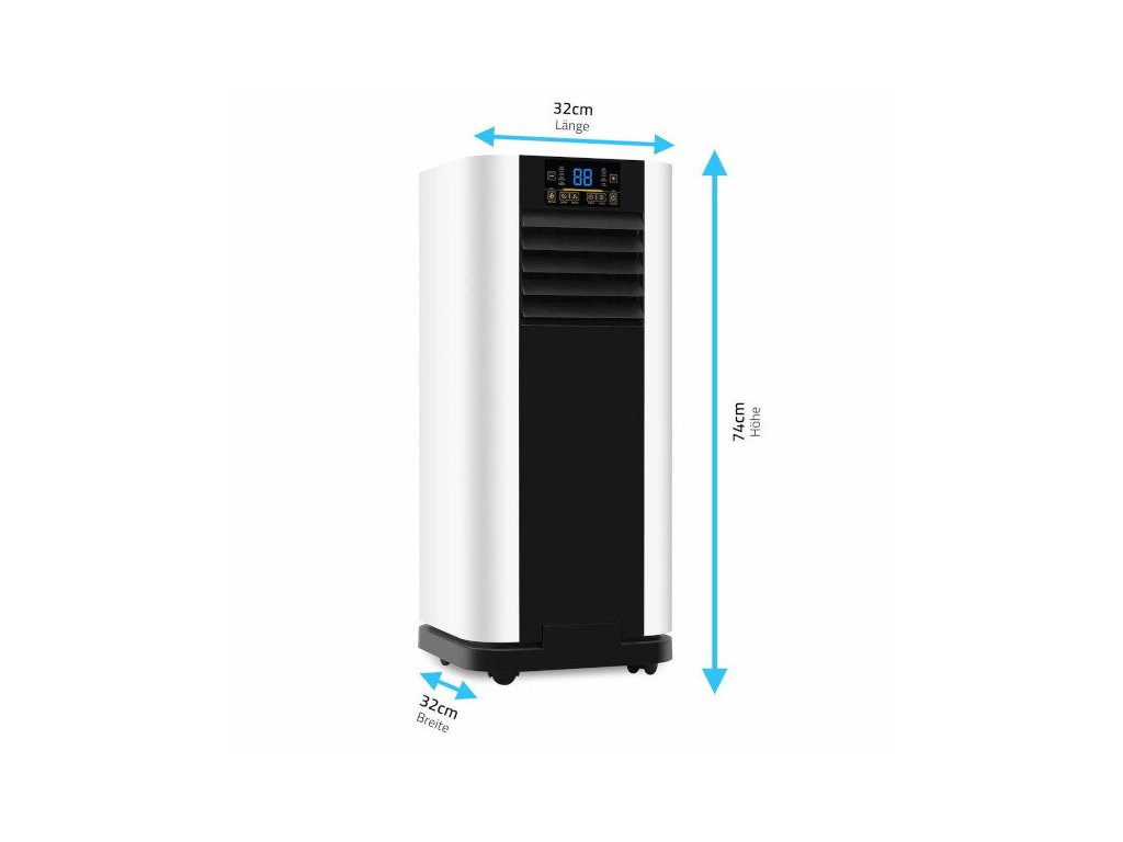 Vďaka pohyblivým kolieskam je zariadenie ľahko presúvateľné, takže je vždy pripravené na použitie tam, kde je najviac potrebné. Flexibilná hadica na vyfukovaný vzduch sa prispôsobí svojmu prostrediu. Klimatizácia je vybavená funkciou odvlhčovania a časovačom, čo umožňuje inteligentnú reguláciu teploty aj počas noci. Integrované filtre zabezpečujú čistenie vzduchu.