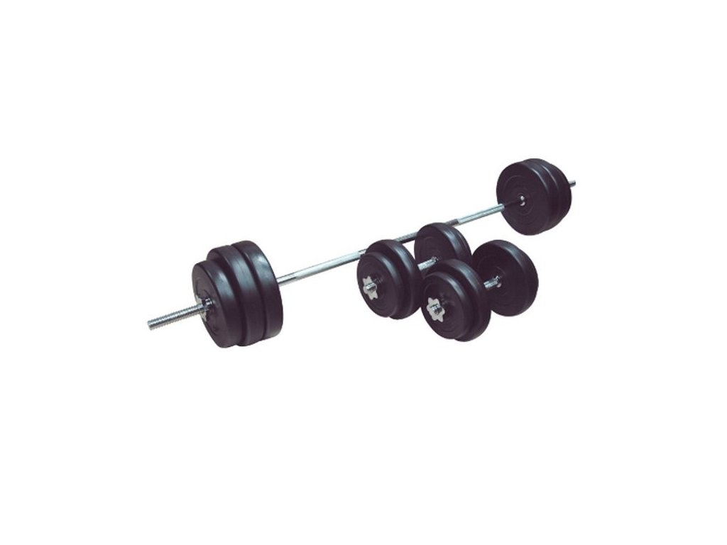 Nakladací cementový set DUVLAN pozostáva z jednej vzpieračskej činky a z dvoch nakladacích jednoručiek s celkovou hmotnosťou 50 kg. Pomocou tohto univerzálneho setu si môžete posilniť všetky svaly hornej polovice tela. Vďaka širokým možnostiam je set vhodný pre domáce posilňovanie.
