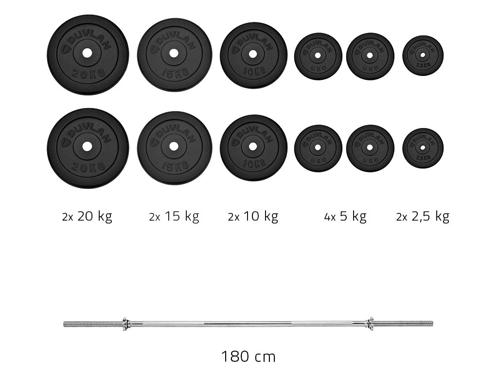 Nakladací oceľový set DUVLAN poskytuje multifunkčné domáce posilňovanie. Set predstavuje vzpieračskú tyč DUVLAN 180 cm so sadou kotúčov o celkovej váhe 125 kg. Hriadeľ činky je vyrobený z kovového materiálu a na oboch koncoch vybavený závitmi pre bezpečnostnú objímku.Tento set je ideálny pre nadšených vzpieračov i vrcholových športovcov!