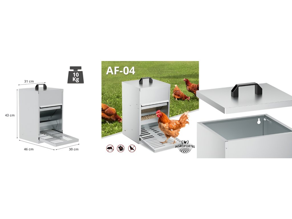 S objemom 16 litrov (približne 10 kg kŕmenia) poskytne dostatok potravy pre 19-25 sliepok.