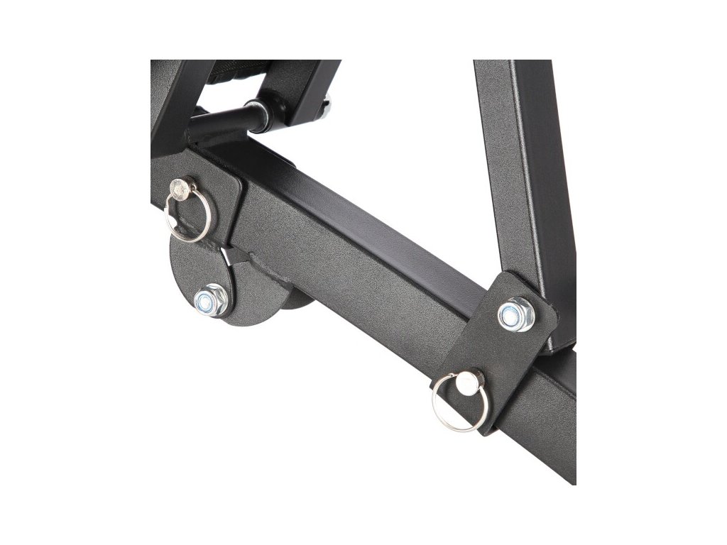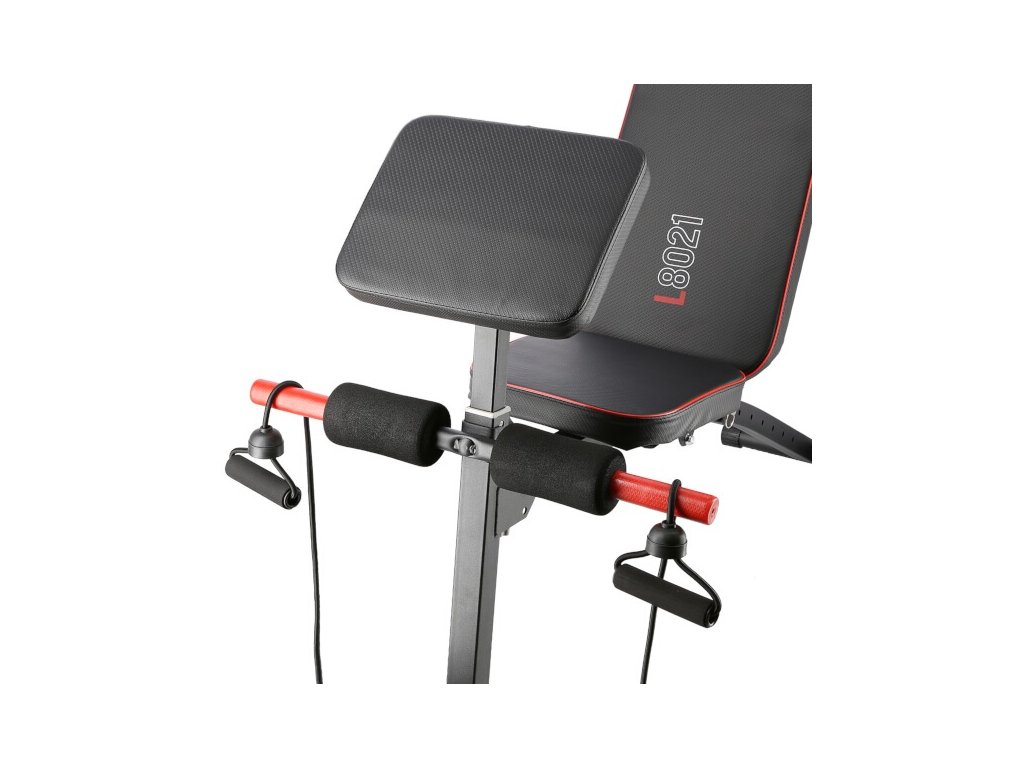 Robustná oceľová konštrukcia s nosnosťou 150 kg je navyše ľahko skladateľná, takže lavica po zložení nezaberá veľa miesta. Model L8021 váži 9,5 kg a jeho sedadlo aj podrúčky sú potiahnuté odolnou syntetickou kožou s protišmykovým povrchom. Operadlo chrbta ponúka nastavenie do 7 polôh v rozmedzí od -20° do 90°, a výška bicepsovej opierky je nastaviteľná do 2 polôh.