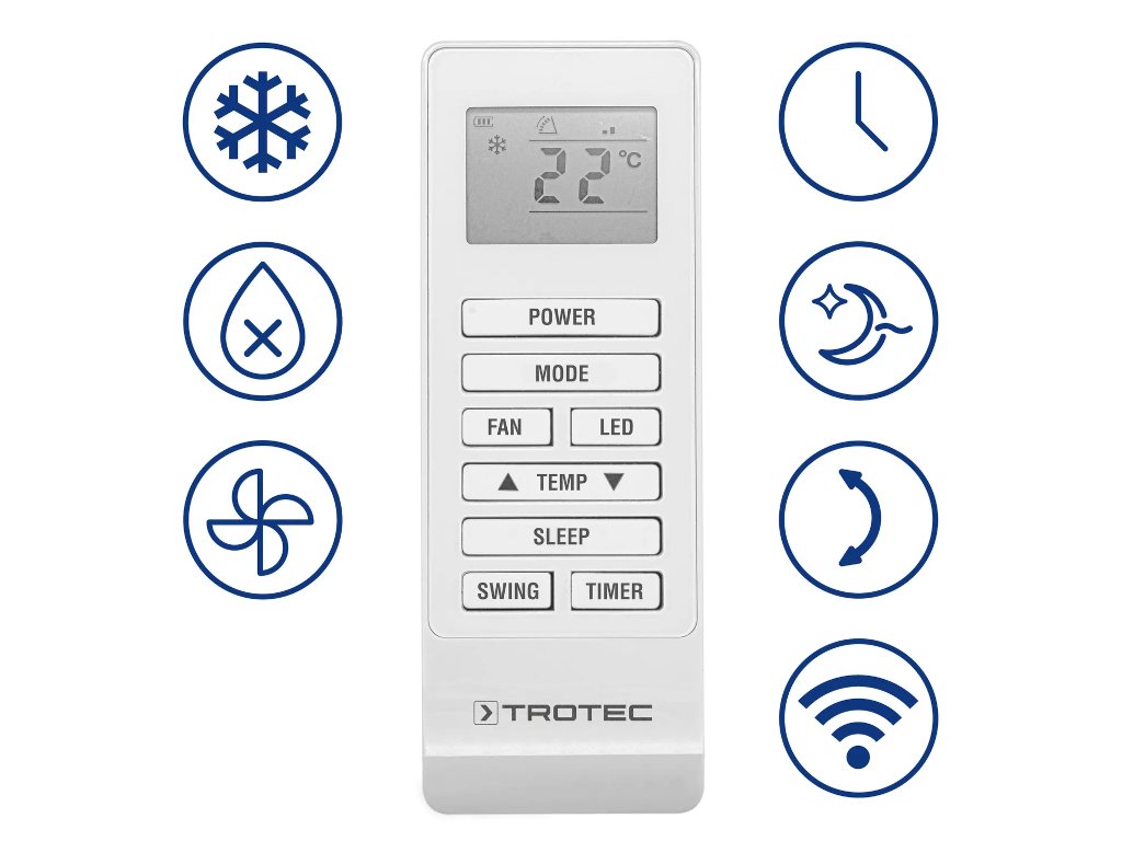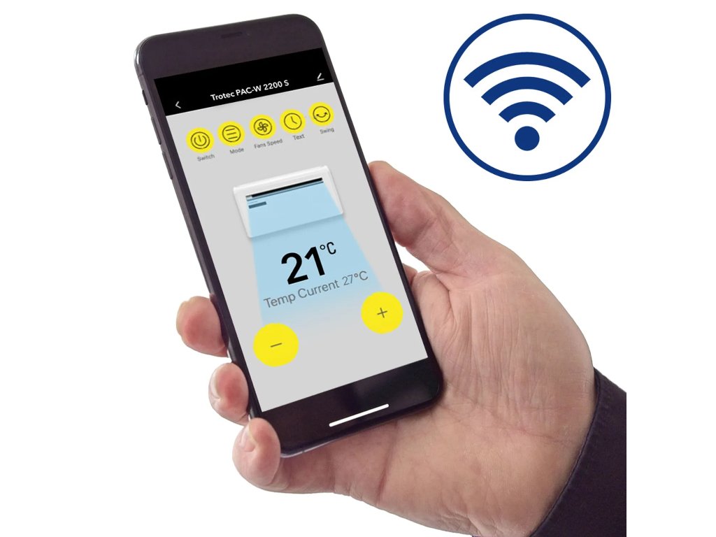 Všetky nastavenia PAC-W 2200 S je možné vykonávať cez intuitívny ovládací panel, IR diaľkový ovládač alebo mobilnú aplikáciu Trotec. Aplikácia umožňuje monitorovať aktuálnu teplotu, nastaviť požadovanú teplotu, zvoliť prevádzkový režim a viac. Systém automaticky reguluje teplotu, chladí miestnosť ešte pred vaším príchodom a vypína sa po vašom odchode. Teplotu môžete nastavovať aj na diaľku.