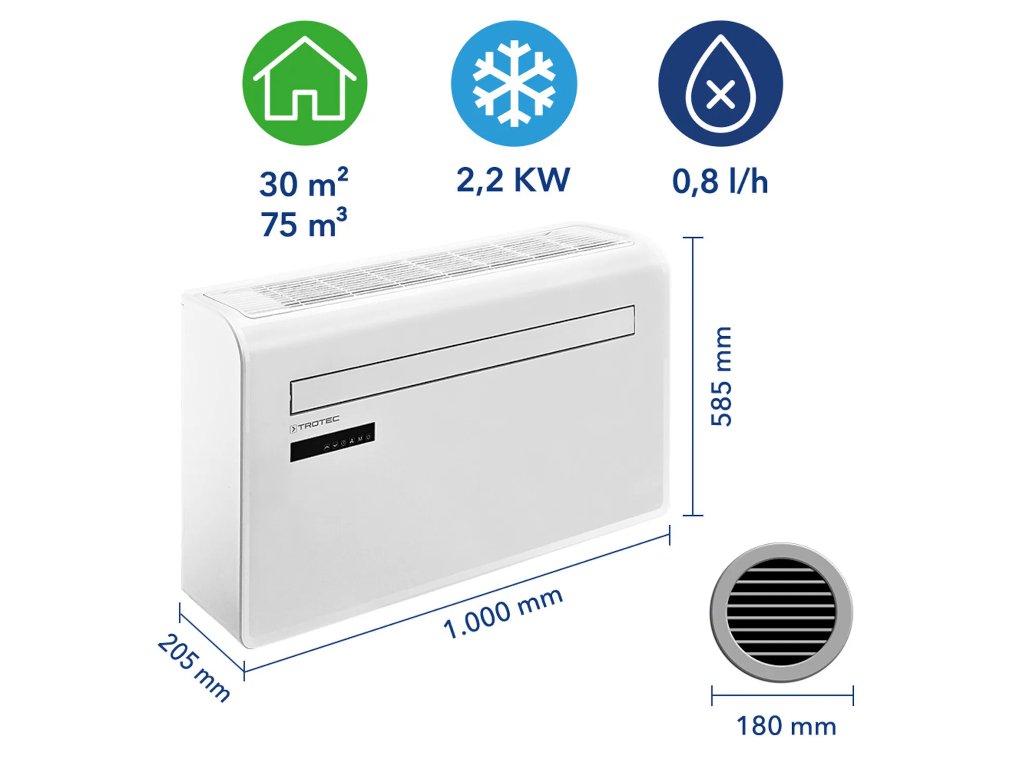 Vďaka najmodernejšej technológii kombinuje klimatizačná jednotka PAC-W 2200 S v štíhlom 20 cm hlbokom kryte tri prevádzkové režimy: