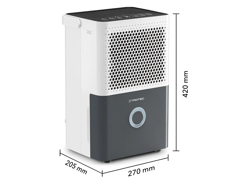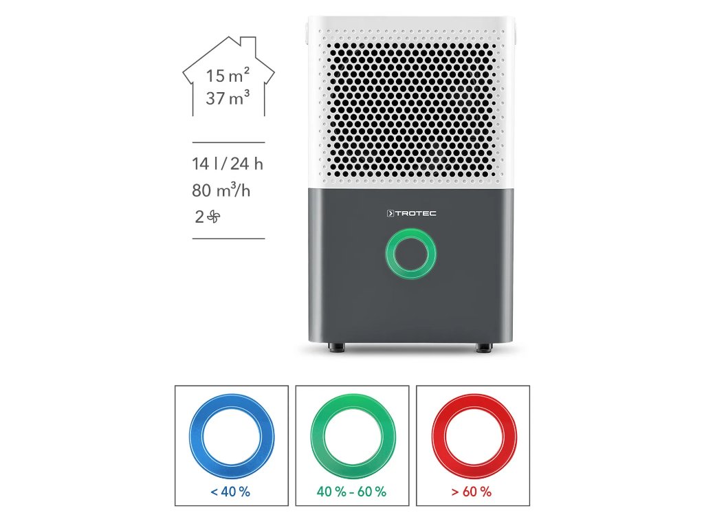 Moderný odvlhčovač TTK 33 E v atraktívnom kockovom dizajne ukončí príliš vlhké miestnosti. S odvlhčovacím výkonom až 14 l / 24 h a 1,5-litrovou nádržou na vodu s ochranou proti pretečeniu sa TTK 33 E šetrný k životnému priestoru odporúča na udržiavanie suchých stredne veľkých miestností do 15 m² alebo 37 m³. Hygrostatom riadený automatický odvlhčovací systém znižuje vlhkosť vnútorného vzduchu v obytných a komerčných priestoroch, kanceláriách, obchodoch a vo vykurovaných zimných záhradách, pivniciach a garážach na prednastavenú cieľovú hodnotu v rozsahu 30 % až 80 % relatívnej vlhkosti.