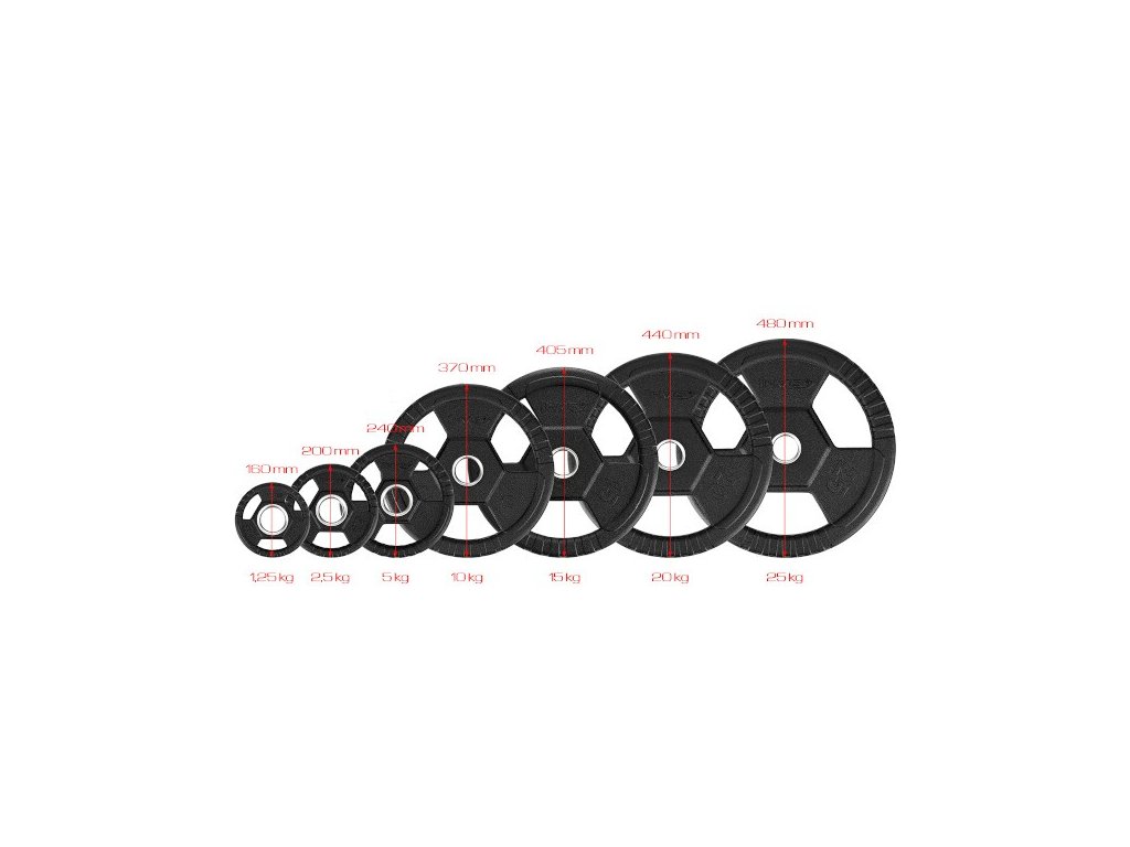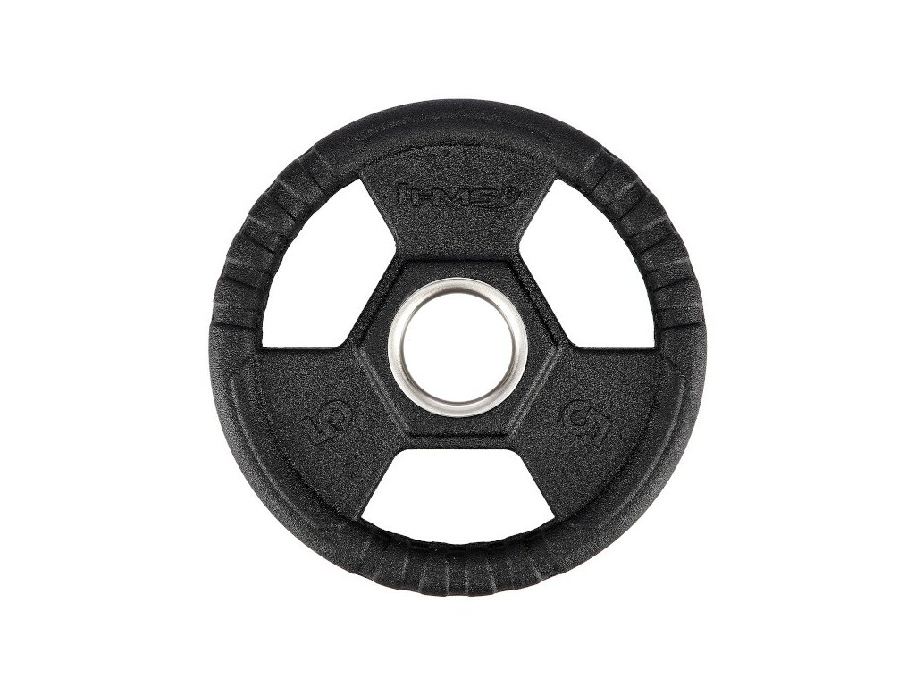 Kotúč HMS TOH05 je navrhnutý je pre olympijské osi s priemerom tŕňa 50 mm. Kotúč je vyrobený z ocele, ktorá je pokrytá tvrdou gumou, čím chráni samotný tanier aj podlahu pred poškodením. Praktické držadlá uľahčujú manipuláciu pri nakladaní a vykladaní z osi a zároveň umožňujú využitie kotúča pri samostatných cvikoch.
