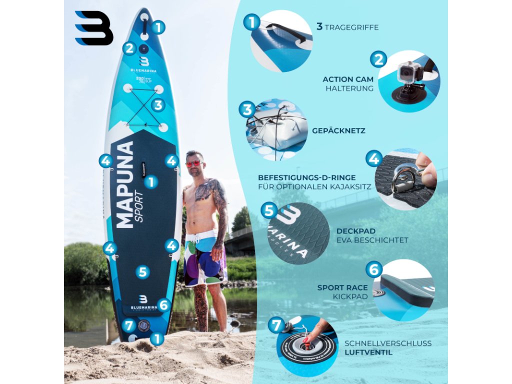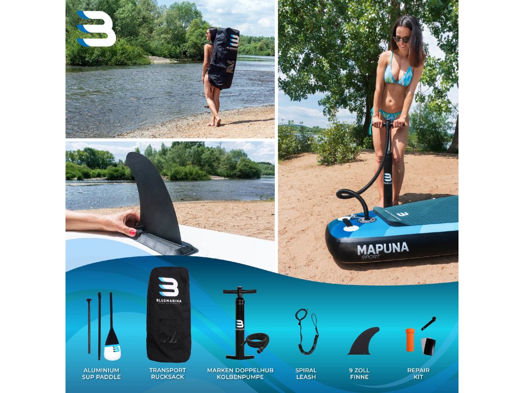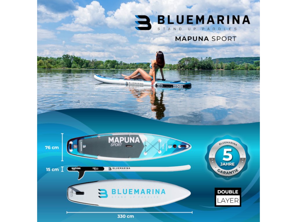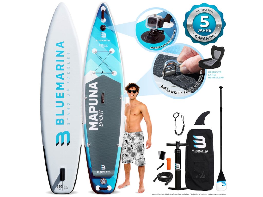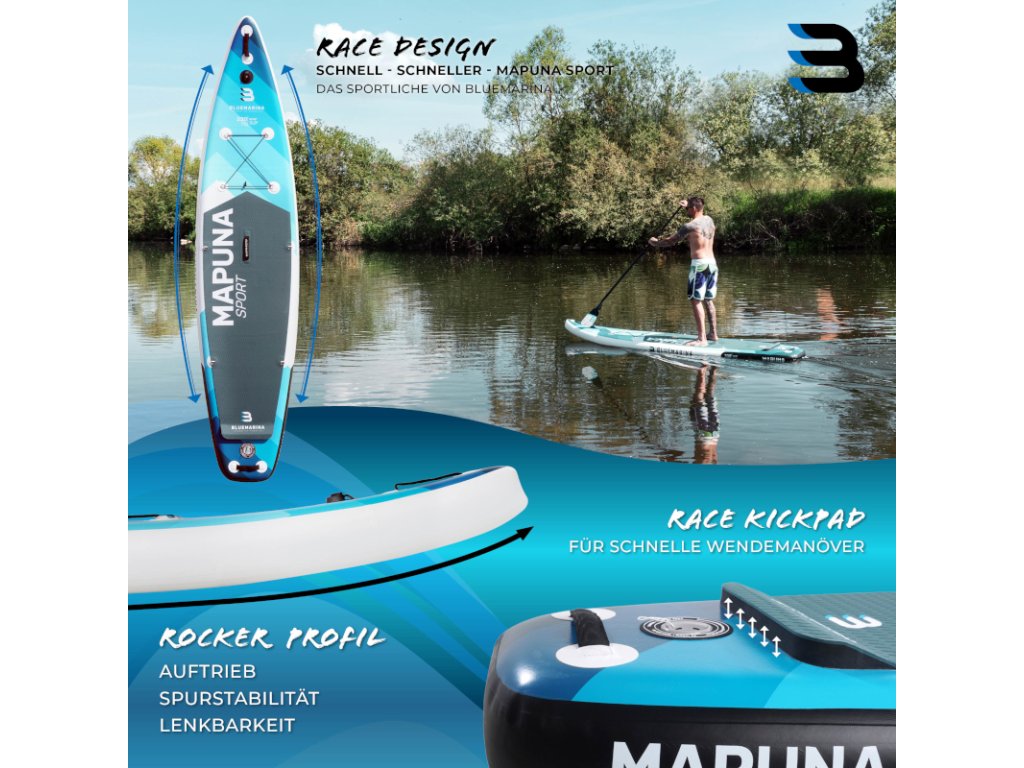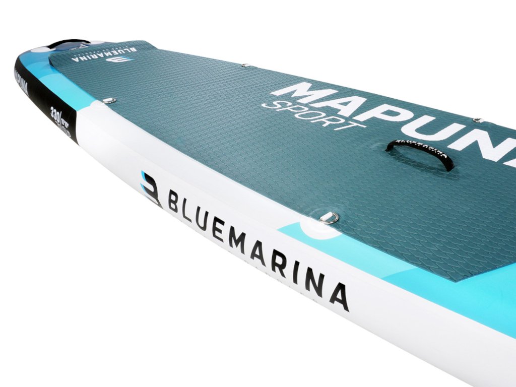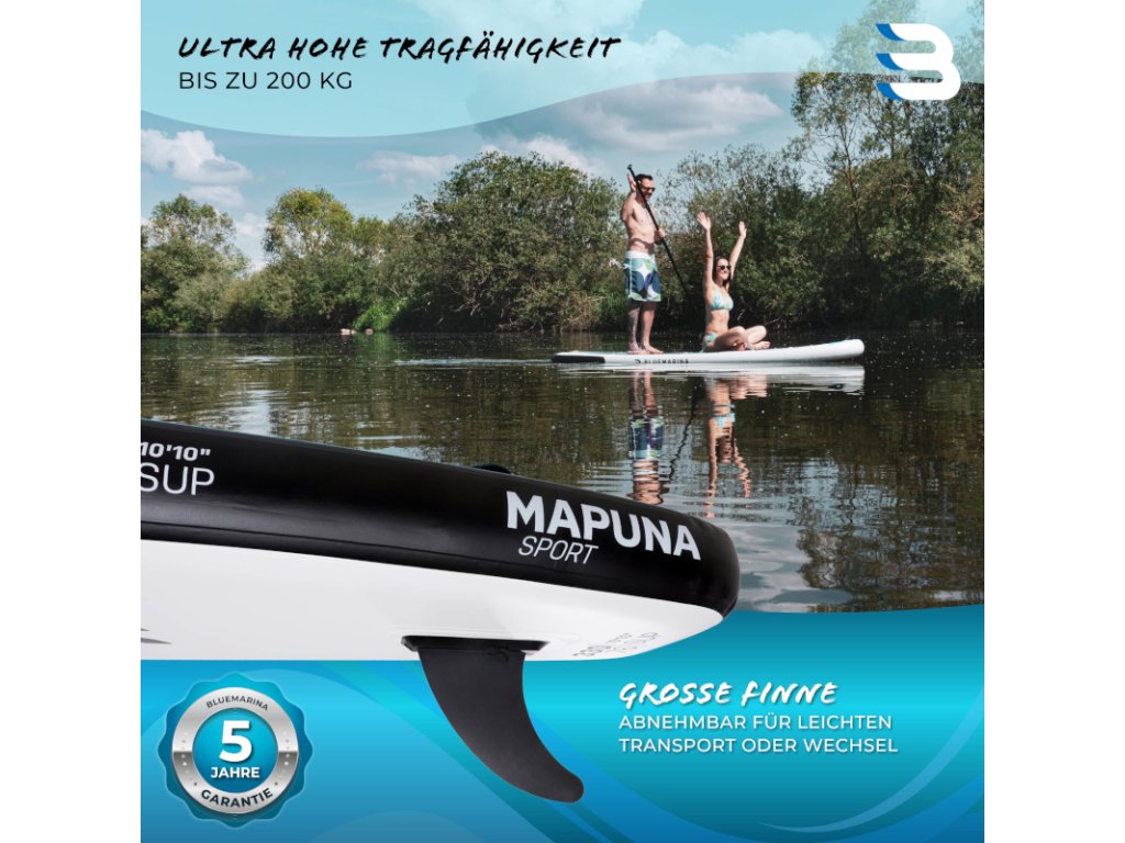 Nafukovacia doska Bluemarina Stand Up Paddle Board Mapuna sa ľahko prenáša a vďaka kvalitnému dvojpiestovému čerpadlu je rýchlo pripravená na vodu. Ultra robustná SUP doska sa dá použiť aj ako kajak a má veľmi vysokú nosnosť s maximálnym zaťažením 200 kilogramov. Doska s protišmykovou povrchovou úpravou je vhodná pre amatérov aj pokročilých používateľov: sú s ňou možné pôsobivé otáčavé manévre a vysoké rýchlosti.
