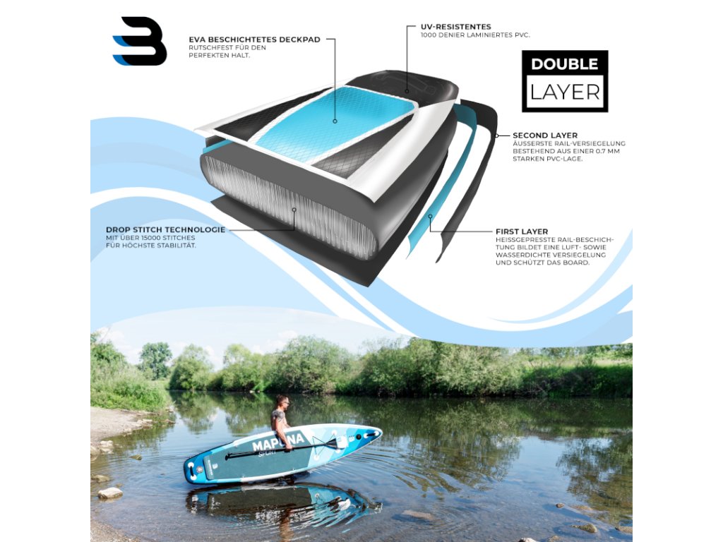 Vďaka dvojvrstvovej technológii a technológii drop-stitch je naša doska Bluemarina Stand Up Paddle Board Mapuna extrémne odolná. Kvalitne spracovaná SUP doska má dve odolné PVC vrstvy (dvojvrstva) namiesto jednej. Povrchy jadra dosky sú spojené cez 15 000 závitov. To dáva paddle boardu vynikajúcu tuhosť pri nafúknutí pri zachovaní hladkého povrchu. Váži veľmi málo, nenafúknutý sa dá zložiť takmer kdekoľvek a je vybavený dobrou UV ochranou. Uchová dosku dlhodobo neporušenú, aj keď ju často vystavujete teplu a slnečnému žiareniu.