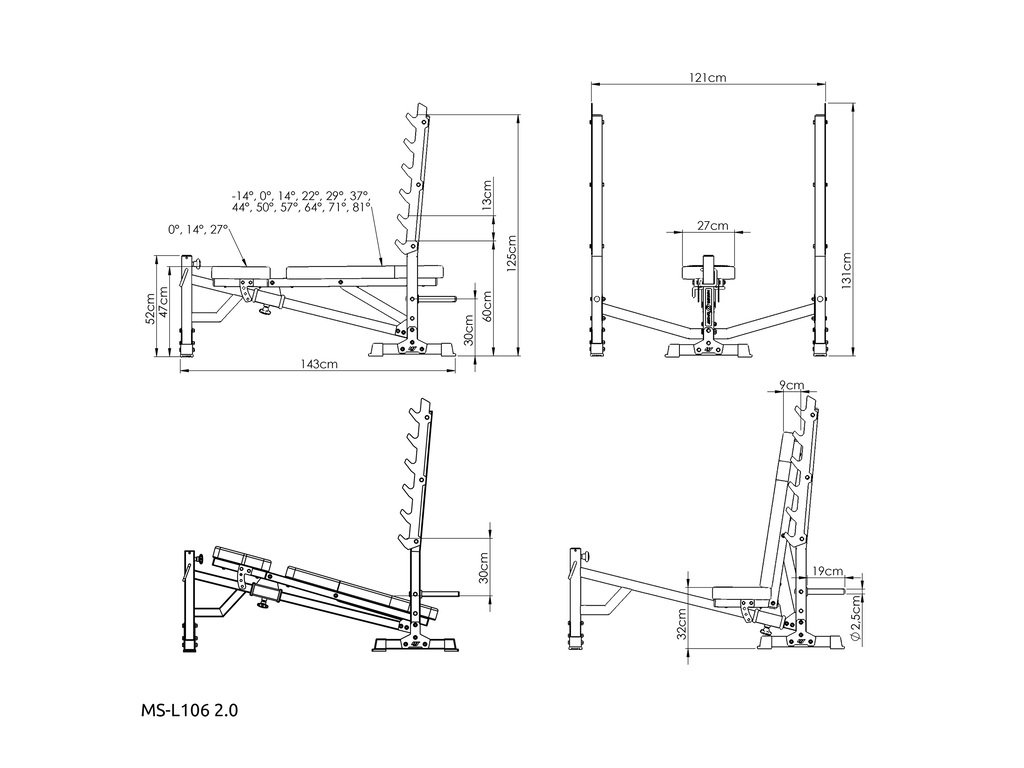 Lavica MS-L106 2.0 je vybavená trojpolohovým nastaviteľným sedadlom a operadlom, ktoré je možné nastaviť do 12 rôznych uhlov (od -14 do 81 stupňov), čo vám umožňuje vykonávať cvičenia v rôznych konfiguráciách.