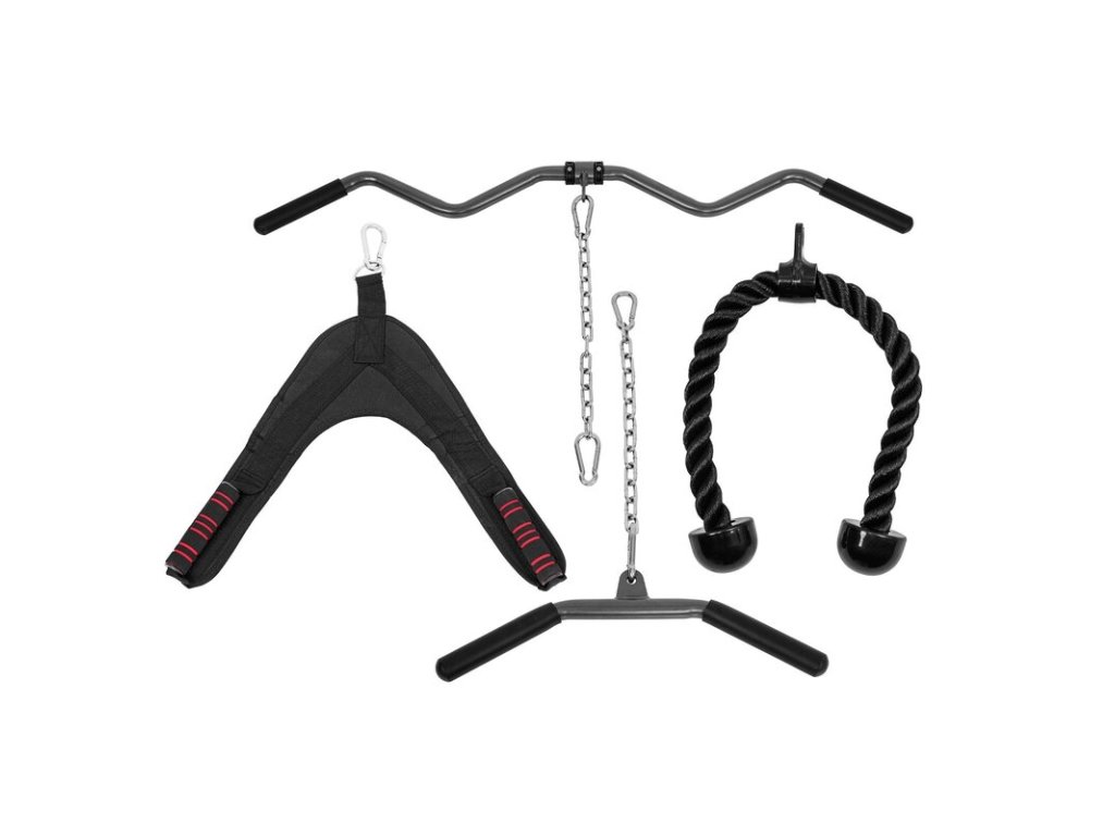 Pribalené príslušenstvo, ako je tricepsová tyč, multifunkčné lano, crunch grip a 40 cm príťahová tyč, ešte viac obohacuje možnosti tréningu. Medzi možné cviky patria tricepsové tlaky, sťahovanie latiek, prsné mušky, tlaky v sede, extenzie nôh, kľuky na bruchu a mnohé ďalšie pre kompletný a pestrý tréning.