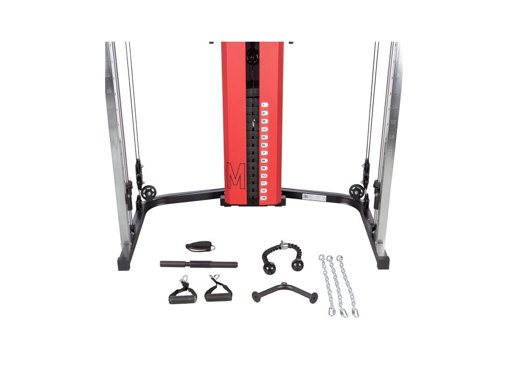 Posilňovacia veža HMS Premium Atom pozostáva z multipress, dve posuvné kladky, rameno na tlaky/motýlika, leg press a hrazdu, takže ide o skutočne komplexný stroj. Súčasťou dodávky je aj dvojité, tricepsové lano, tricepsový adaptér, popruhy ku kladkám a opasok na členok.