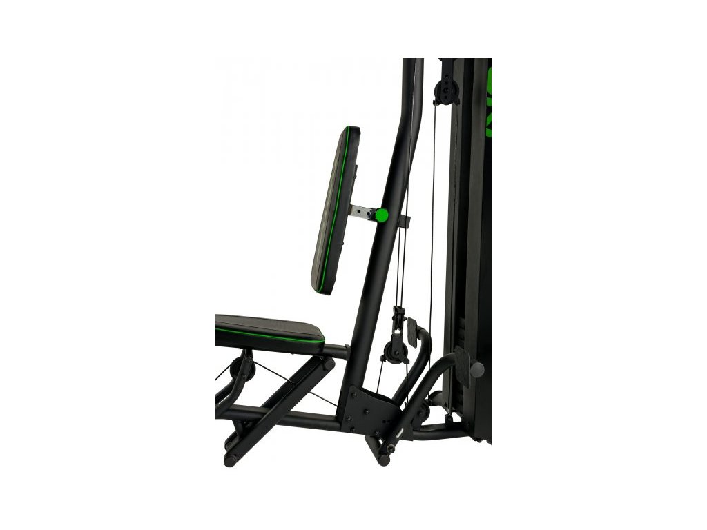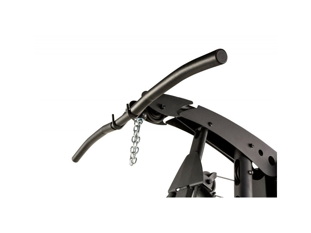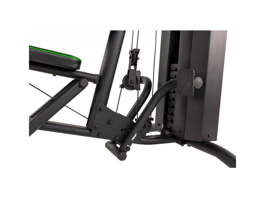 Horný kladkový systém s lat bar, prostredná kladka na posilňovanie brušných svalov a spodný kladkový systém s rovnou tyčou a podložkou pod nohy na veslovanie v sede.