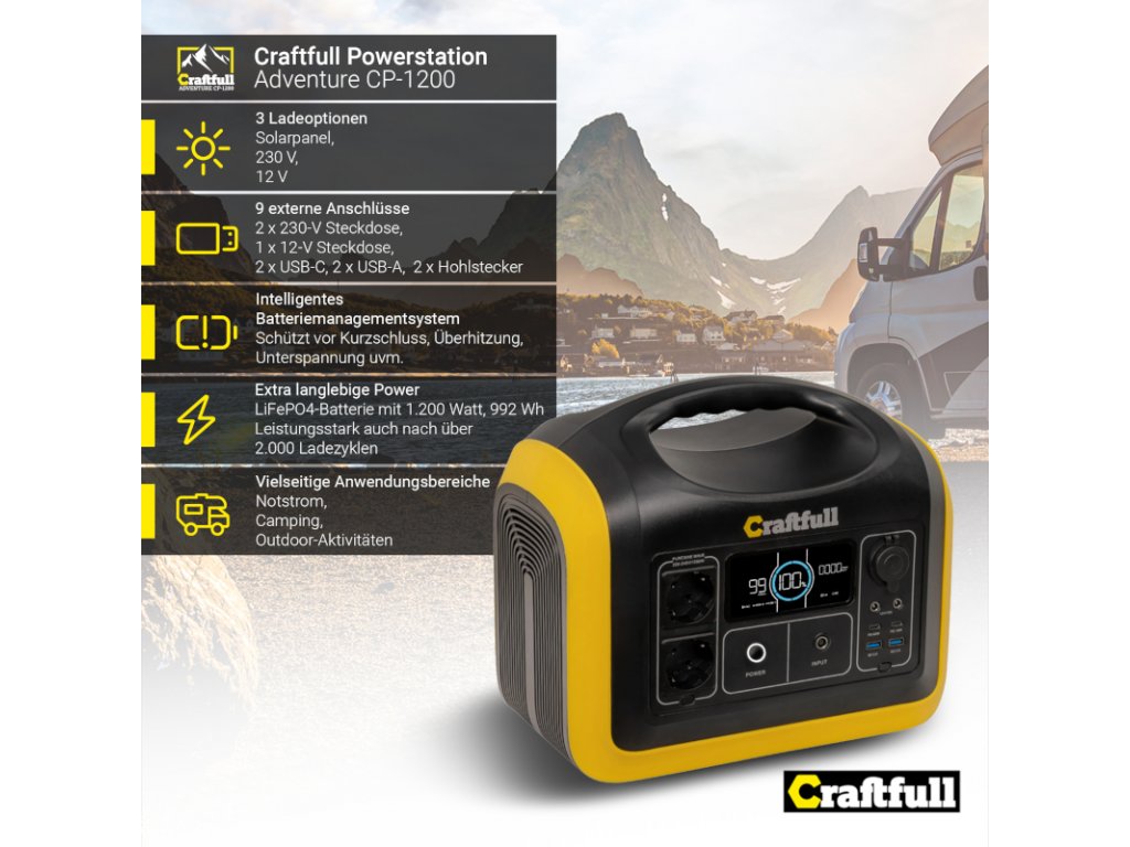 V karavane je k dispozícii iba jedna 12-voltová zásuvka? Craftfull Powerstation Adventure CP-1200 poskytuje riešenie! Pretože paralelné nabíjanie a vybíjanie nie je problém! Takto získate maximum možností z vašej elektrárne.