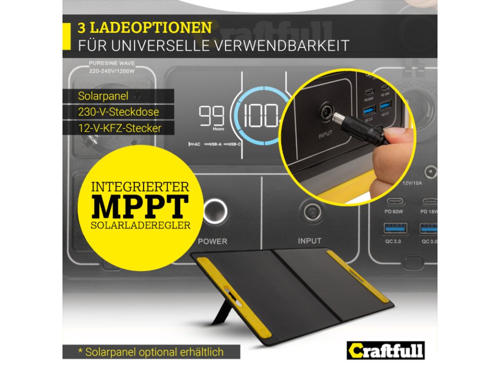 Systém off-grid vám poskytuje energiu, ktorú potrebujete, nech ste kdekoľvek. Craftfull Powerstation Adventure CP-1200 zaujme vysokým výkonom 1 200 wattov alebo 992 Wh . Nielen, že svoje malé elektronické zariadenia nabijete niekoľkokrát, ale bez problémov obslúžite aj väčšie zariadenia ako je chladnička, rýchlovarná kanvica či dokonca televízor. Potrebné spojenia od 230 voltových zásuviek po 12 voltovú zásuvku a niekoľko USB nabíjacích integrovaných zásuviek. Aby vám nikdy nedošla šťava, táto elektráreň zaujme tromi možnosťami nabíjania . A to nie je všetko: V spojení so solárnym panelom dosiahnete úplnú energetickú sebestačnosť. Dôverujte mobilnému napájaciemu zdroju od Craftfull!