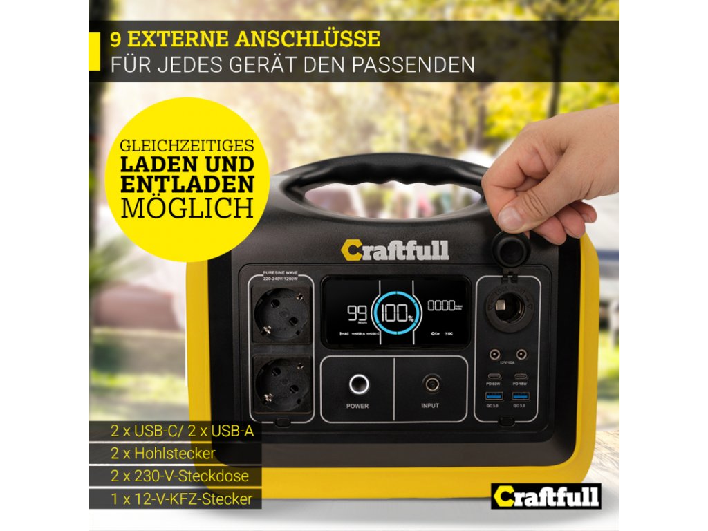 Elektráreň dodáva núdzovú energiu vždy, keď je to potrebné. S Craftfull Powerstation Adventure CP-1200 je ale zabezpečené aj napájanie pre všetky outdoorové aktivity alebo kempingové dovolenky. So siedmimi integrovanými pripojeniami môžete bez problémov ovládať všetky svoje zariadenia.