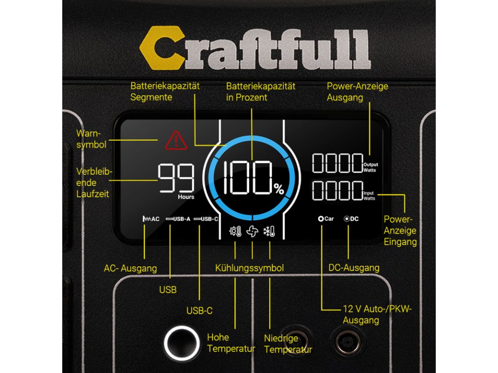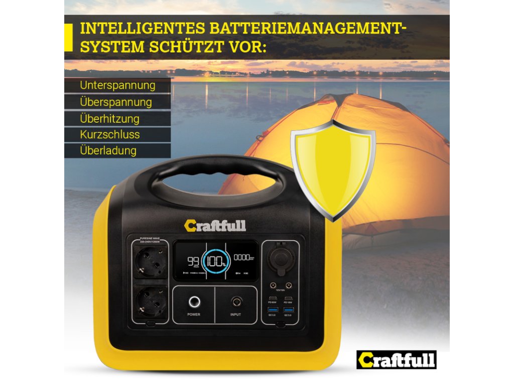 Či už ako núdzové napájanie alebo ako zdroj energie počas dovolenky v kempingu – na Craftfull Powerstation sa môžete spoľahnúť! Zaujme mimoriadne vysokým počtom nabíjacích cyklov s takmer žiadnou stratou výkonu. Komplexný systém správy batérií vrátane ochrany proti prepätiu a ďalších stojí za skvelú funkčnosť nabíjacej stanice.