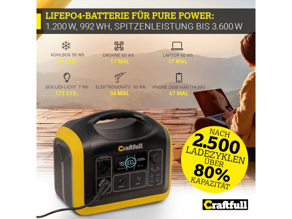 Kapacita LiFePO4 batérie je aj po 2 500 nabíjacích cykloch stále väčšia ako 80 % . Vydrží asi 5x dlhšie ako porovnateľné lítium-iónové batérie od konkurencie. Využite výhody tejto vysokej kvality. Craftfull Powerstation CP- 1200 je dlhodobá investícia smerom k napájaniu nezávislému od siete.