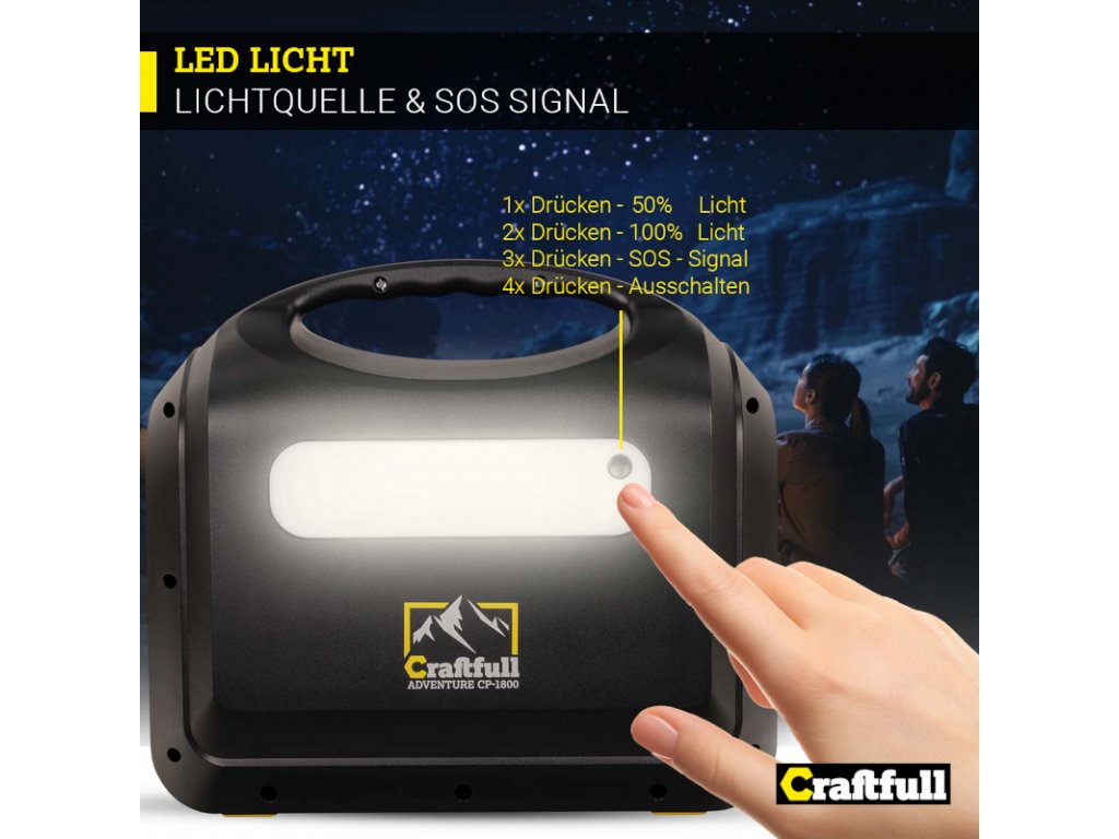 Pri LED svetle si môžete vybrať z dvoch úrovní jasu. A dokonca sa myslelo aj na signál SOS. Či už osvetlenie v prípade výpadku prúdu alebo ako lampa v stane: užitočná funkcia dopĺňa Craftfull Powerstation Adventure CP-1200.